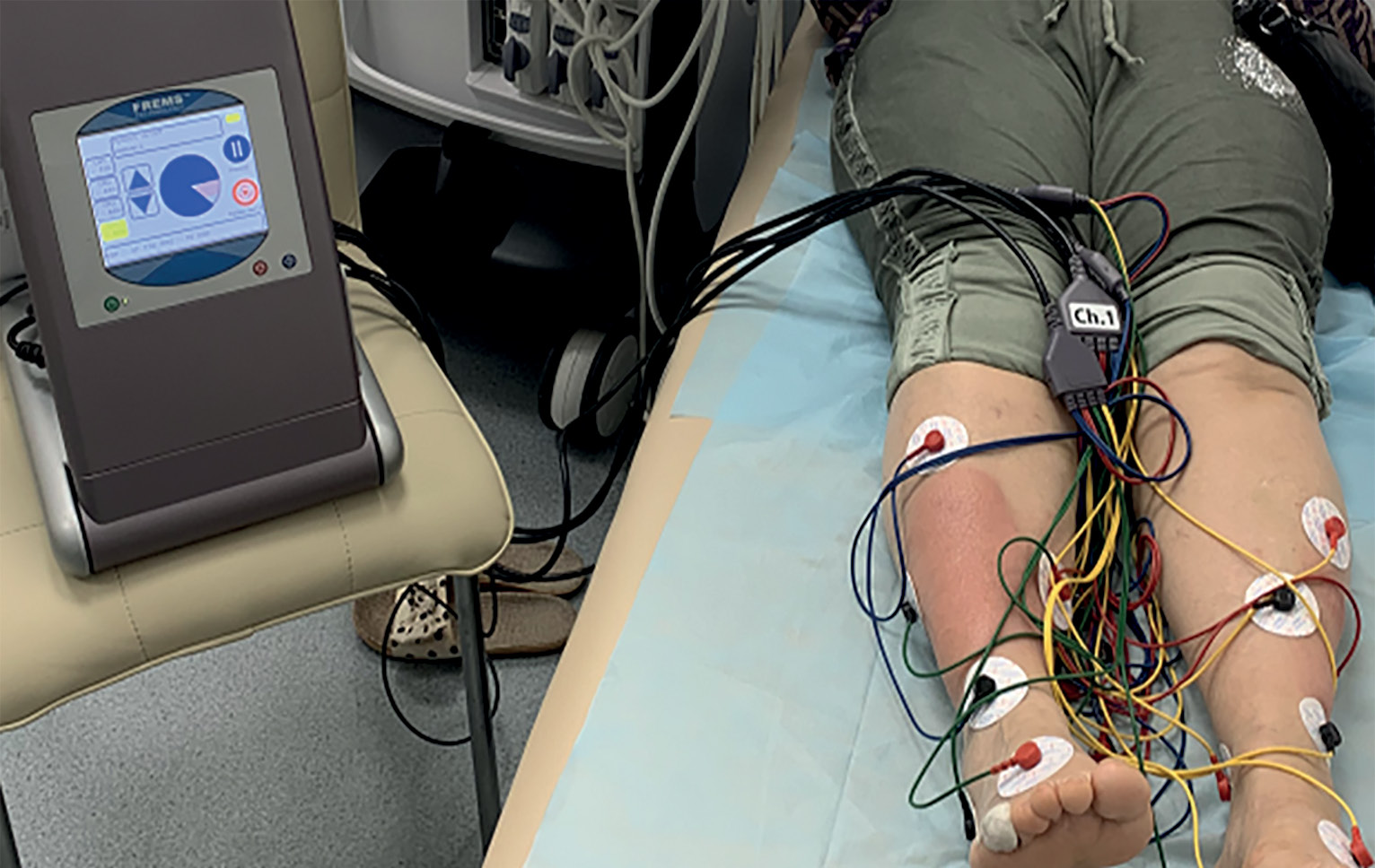 Данный метод применяется для лечения болевой формы дистальной полинейропатии, хронической венозной недостаточности, имеются данные о лечении трофических язв нижних конечностей, также описан клинический случай успешного применения при нейролипоматозе (болезни Беркума) [5]. FREMS-терапия включает генерирование биосовместимых электрических сигналов с помощью компьютеризированных нейростимуляторов и их воздействие через чрескожные электроды. Высокое отрицательное напряжение позволяет осуществлять деполяризацию клеточной мембраны и открывает ионные каналы, реактивируя физиологический ответ и стимулируя восстановление естественного гомеостаза клетки. За счет данных эффектов достигается усиление локального кровотока (в том числе за счет повышения экспрессии сосудистого эндотелиального фактора роста (VEGF)) [6], уменьшение межтканевого отека [7].