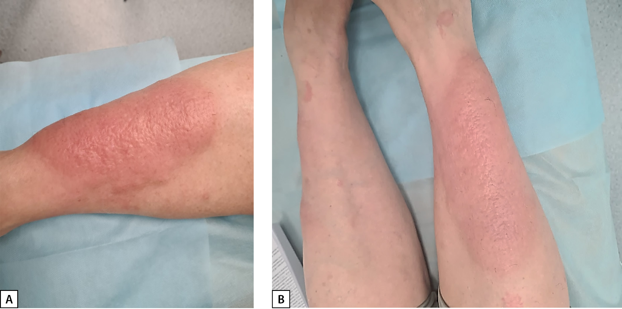 Зимой 2020 г. стала отмечать локальный отек и гиперемию голеней. Неоднократно обращалась к дерматовенерологу, эндокринологу, ревматологу по месту жительства. Верифицировать точный диагноз не удалось. Проводились различная терапия (десенсибилизирующие средства, ангиопротекторы, антибактериальные препараты) и местное лечение (топические ГК, смягчающие средства), без эффекта.