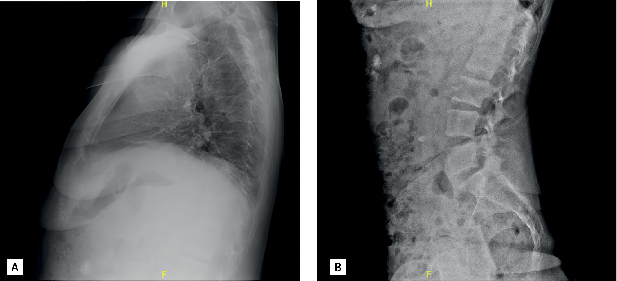1. Рисунок 1. Рентгенография позвоночника пациентки В.: грудного (А) и поясничного (В) отделов в боковой проекции. Пояснения в тексте.