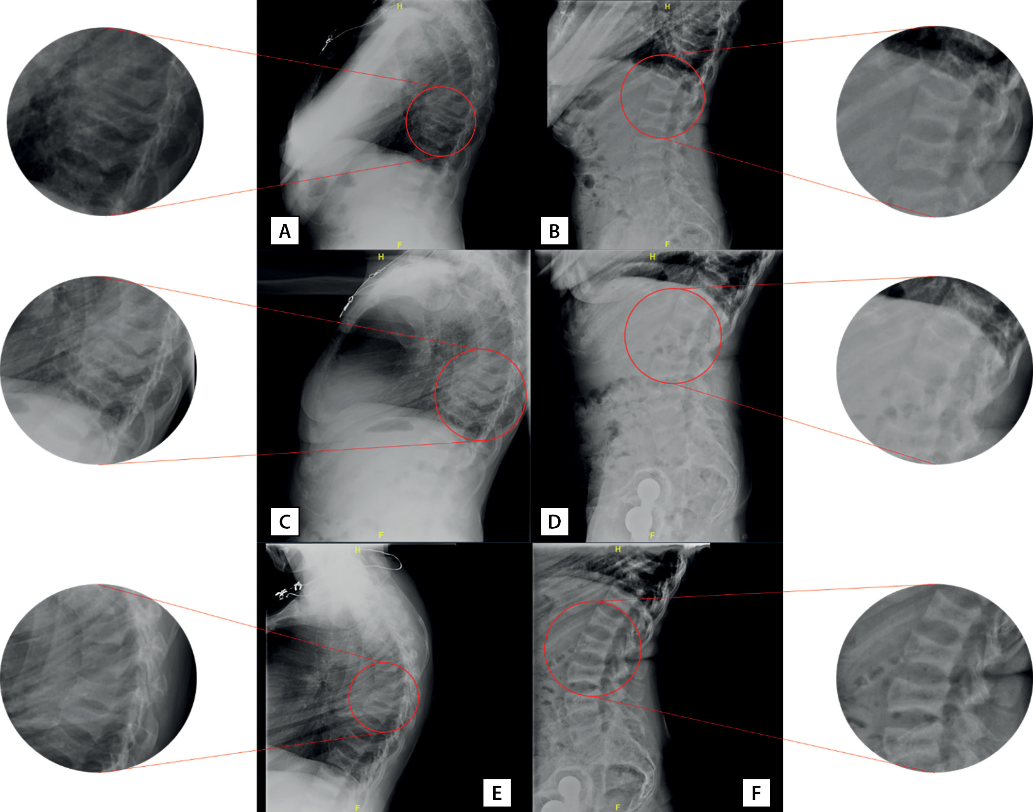 2. Рисунок 2. Рентгенография позвоночника пациентки А.: грудной (А, C, E) и поясничный (В, D, F) отделы в боковых проекциях. А и В — июль 2018 г., C и D — сентябрь 2019 г., Е и F — сентябрь 2020 г. Пояснения в тексте.