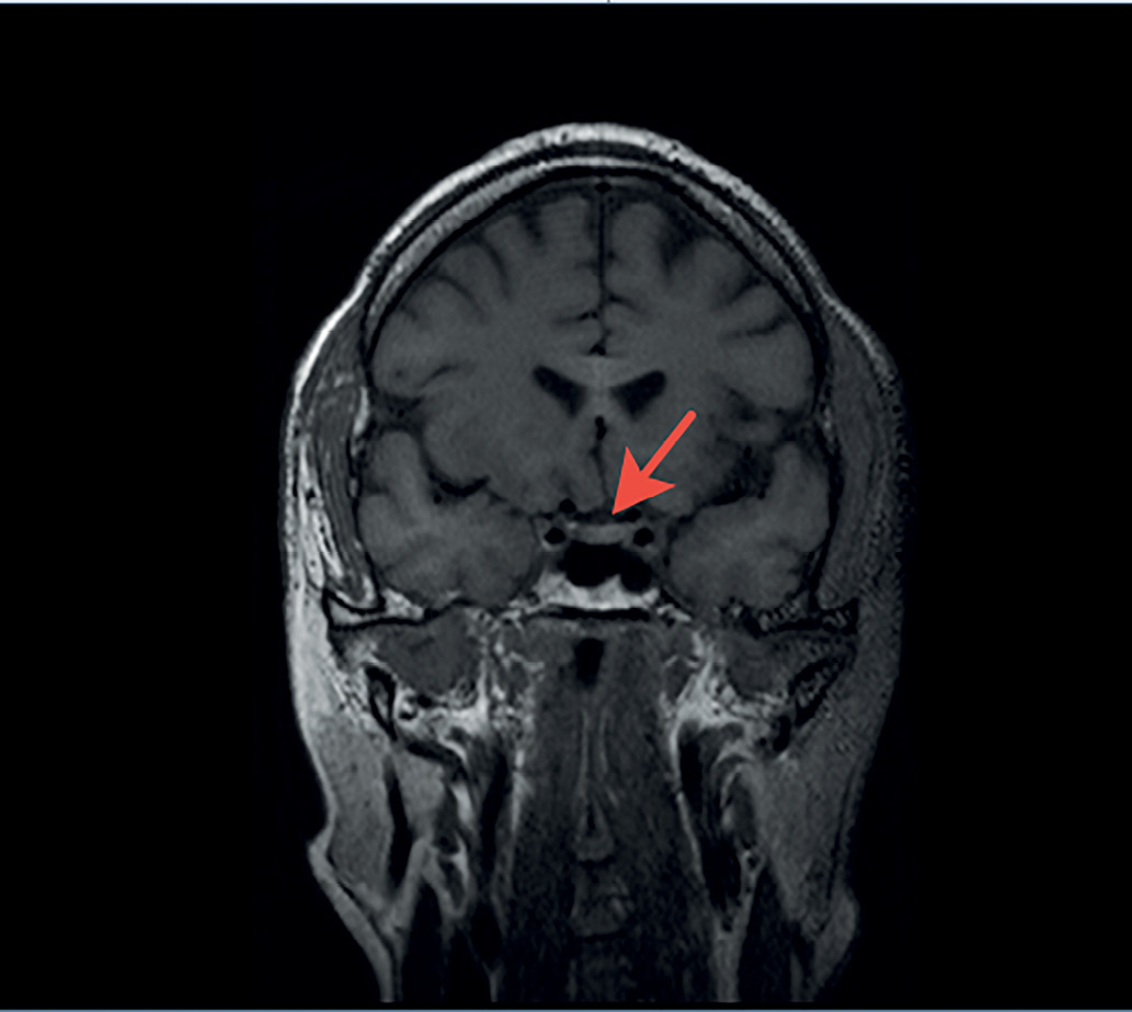 1. Рисунок 1. МР-картина хиазмально-селлярной области пациента. Фронтальный срез.