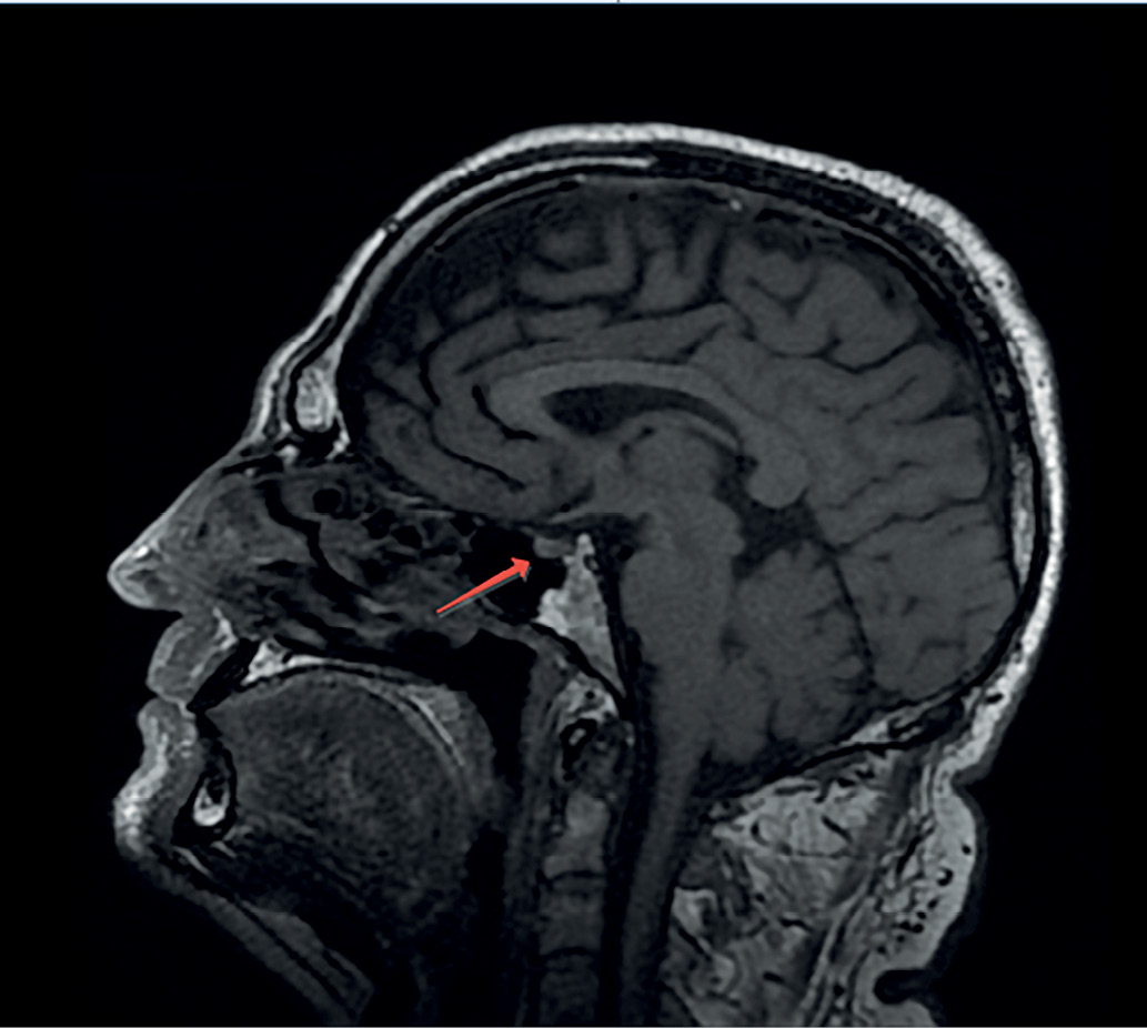 С целью визуализации хиазмально-селлярной области пациенту выполнена магнитно-резонансная томография (МРТ), которая не выявила опухолевых или воспалительных образований и аномалий развития головного мозга. Гипофиз имеет нормальные размеры: вертикальный — 5 мм, поперечный — 13 мм, переднезадний — 9,1 мм. Структура аденогипофиза однородная, воронка расположена по средней линии (рис. 1, 2). Отмечено отсутствие типичного сигнала от задней доли гипофиза,а проведение контрастного усиления не выявило каких-либо дополнительных изменений гипоталамо-гипофизарной области, в связи с чем диагноз идиопатического ЦНД у пациента был подтвержден.