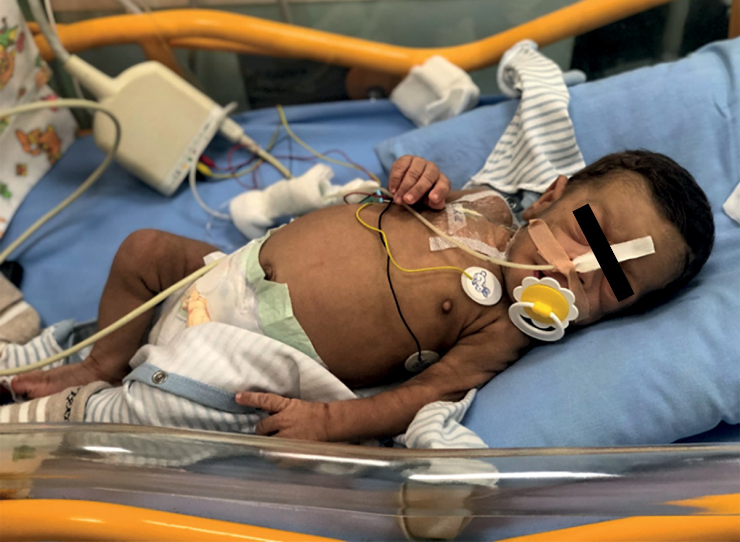 В возрасте 2 мес масса тела 2,93 кг (SDS -5,12), рост 48 см (SDS роста -5,08), при осмотре обращали на себя внимание типичные стигмы дисэмбриогенеза: микрогнатия, гипертрофия сосков, «лягушачий живот», преобладание мозгового отдела черепа над лицевым, отсутствие подкожно-жировой клетчатки, выраженный тотальный акантоз, гипертрихоз (рис. 1), задержка психомоторного развития, диффузная мышечная гипотония. Также отмечалась одышка до 50–60 дыхательных движений в минуту и тахикардия до 170 в минуту.