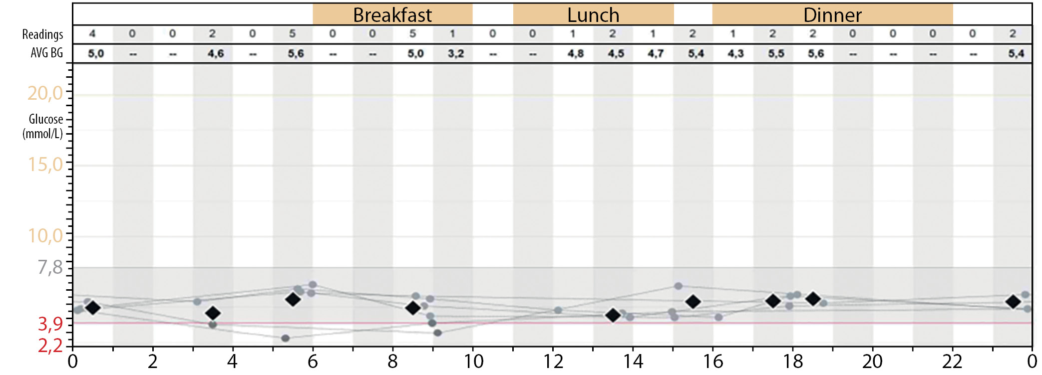 Рисунок 2. Данные непрерывного мониторирования гликемии на фоне дробного режима кормления: 60–70 г каждые 2,5–3 ч, 40 г каждые 1,5 часа.