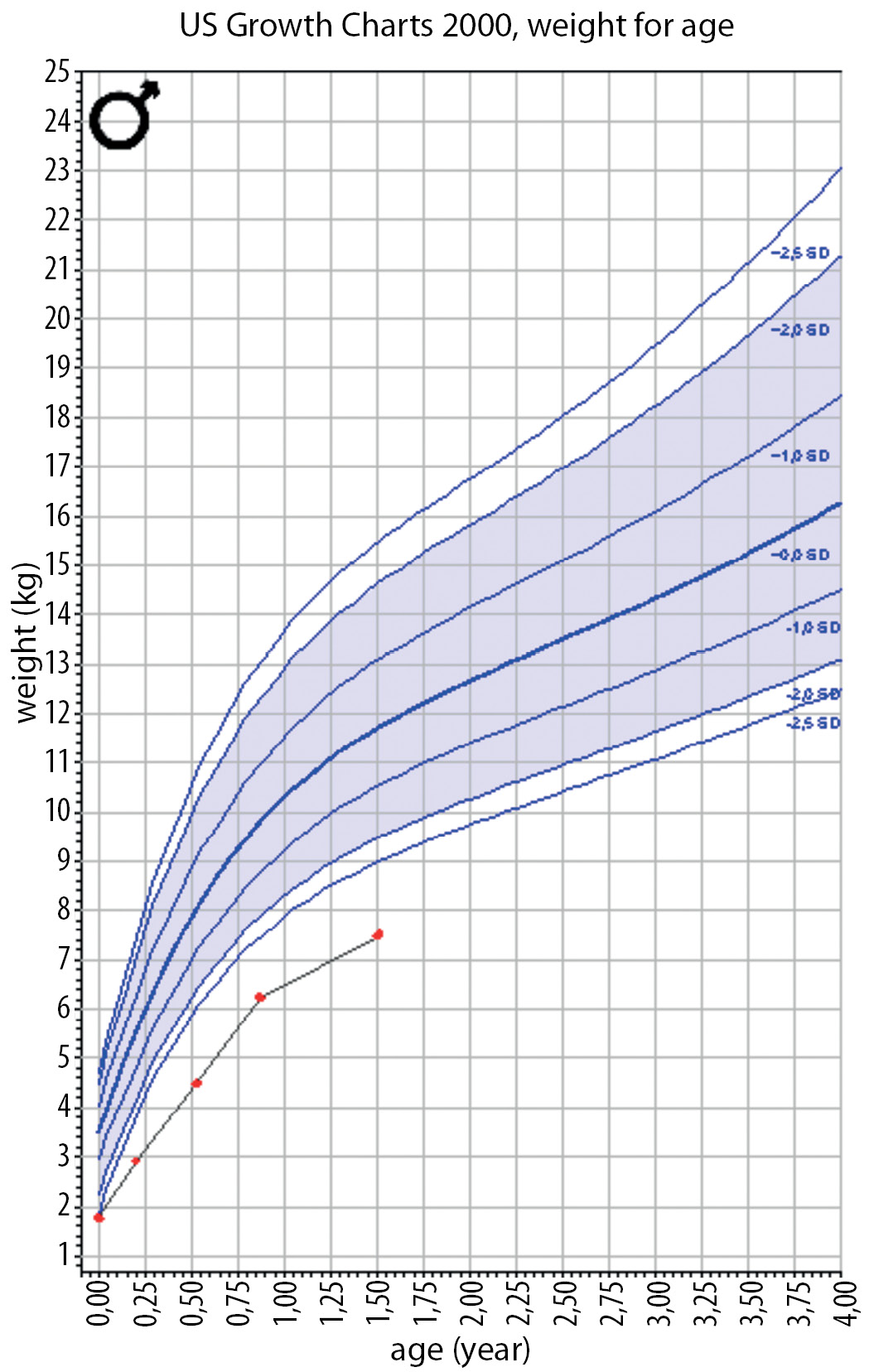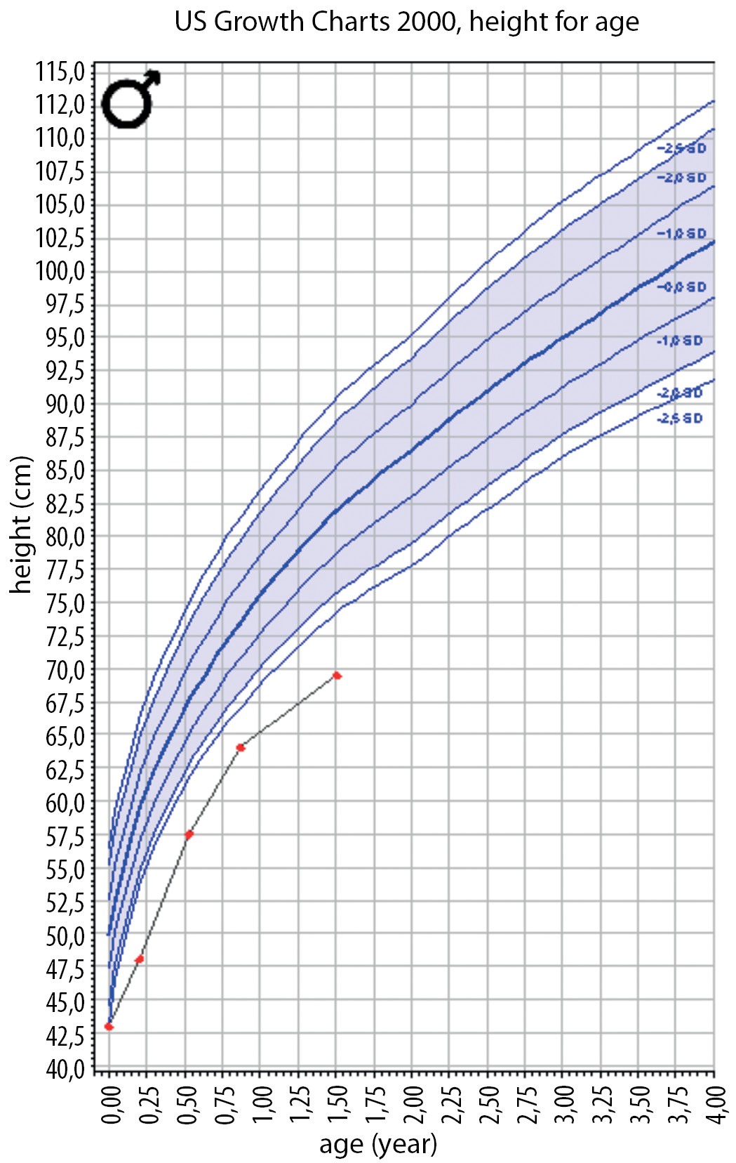 Наш пациент родился с низкими весо-ростовыми показателями: масса тела 1788 г (SDS –3,09), длина тела 43 см (SDS –2,7), оценка по шкале Апгар 8/8 баллов. При осмотре обращали на себя внимание отсутствие подкожно-жирового слоя, смуглые и сухие кожные покровы, выраженный гипертрихоз, множественные стигмы диcэмбриогенеза.