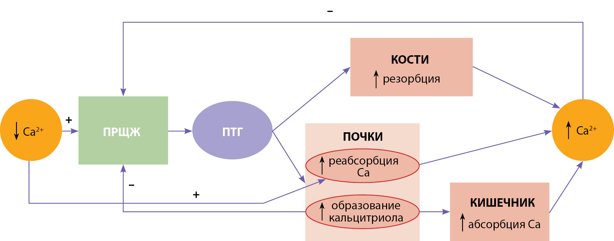 Все вышеперечисленные процессы приводят к повышению кальция в крови и по механизму отрицательной обратной связи, наряду с кальцитриолом, подавляют секрецию ПТГ [12].