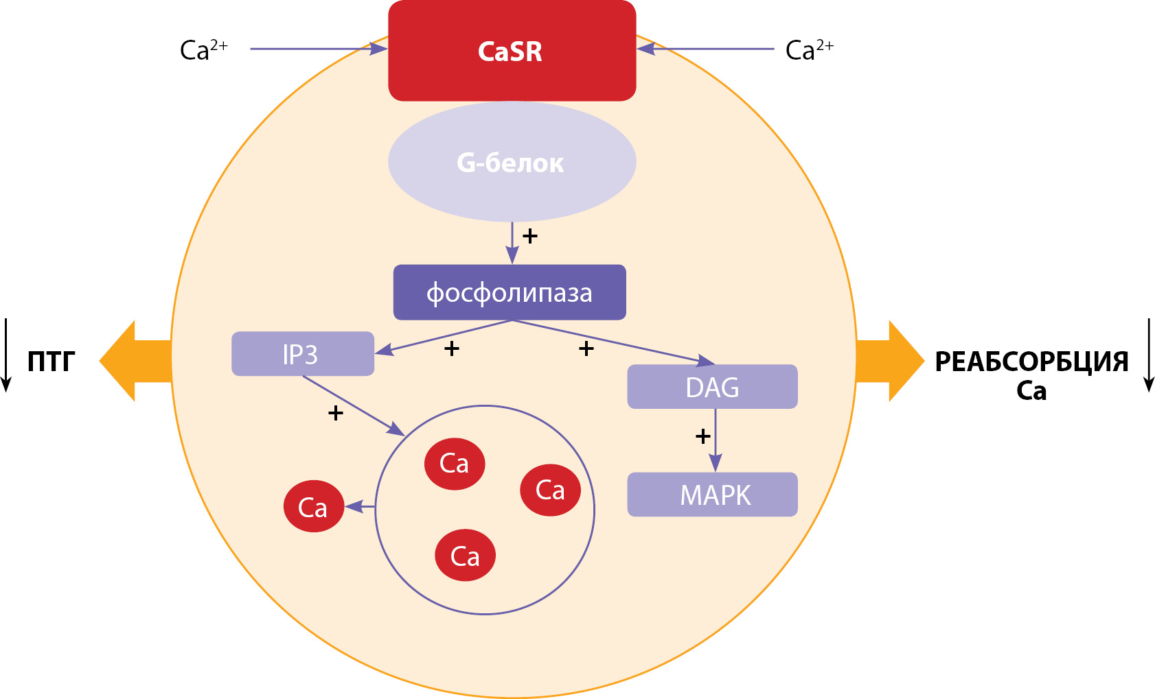 Ca — кальций; CaSR — кальций-чувствительный рецептор; IP3 — инозитол-1,4,5-фосфат; DAG — диацилглицерол; MAPK — митоген-активируемая протеинкиназа; ПТГ — паратгормон.