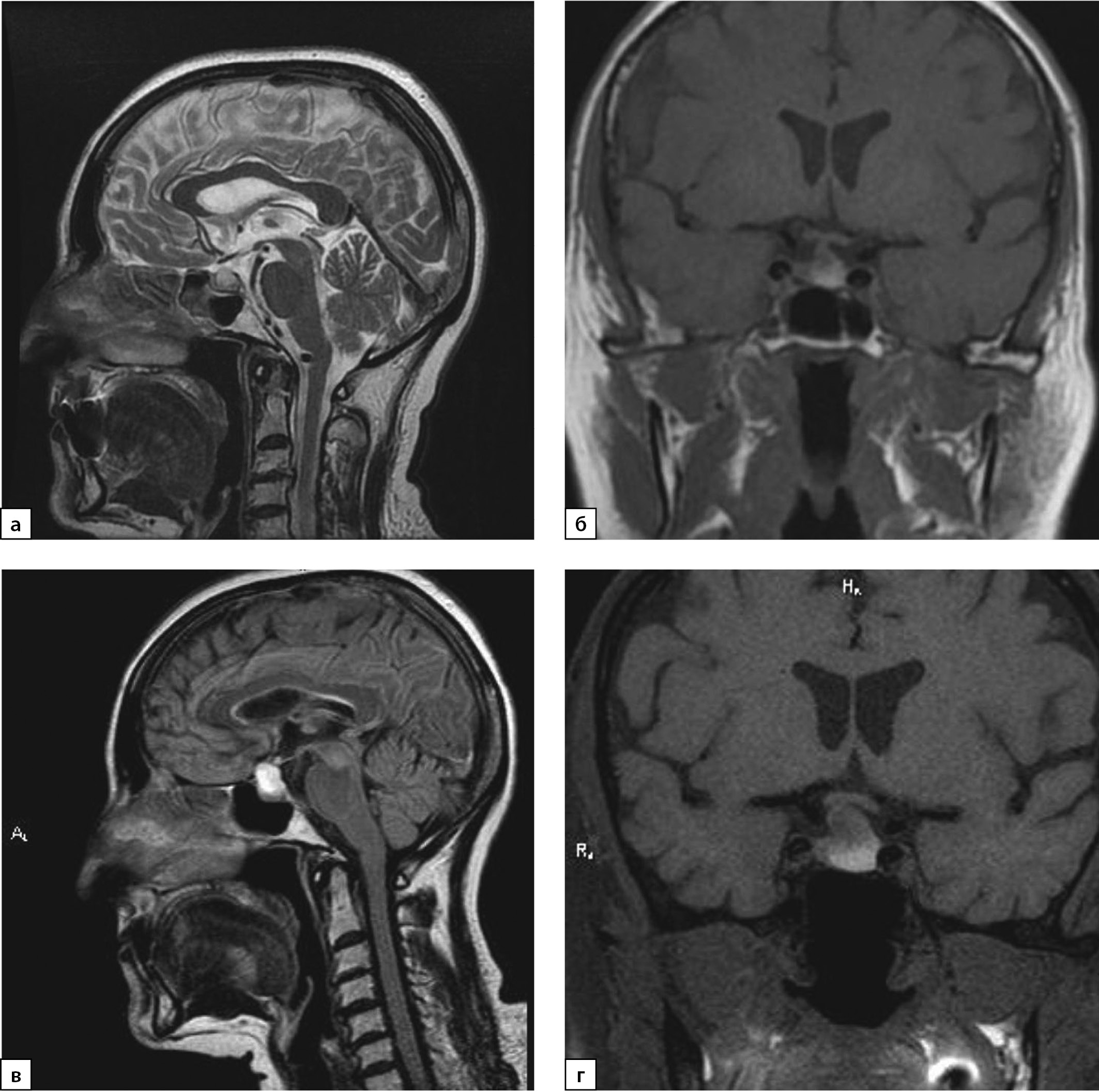 В ноябре 2021 г. пациентка по собственному желанию в одной из клиник г. Москвы выполнила МРТ головного мозга. Сохраняется МР-картина эндосупраселлярного объемного образования размерами 18×13×14 мм, в дифференциальный диагноз следует включить макроаденому гипофиза и краниофарингиому. При сравнении с представленными снимками МРТ от 11.11.2019 г. отмечается увеличение размеров образования, от 27.07.2021 г. — динамических изменений нет. Таким образом, ревизия МРТ исследования от 2019 г. свидетельствовала об имевшемся, но не описанном ранее образовании гипофиза меньших размеров (рис. 1а, б).