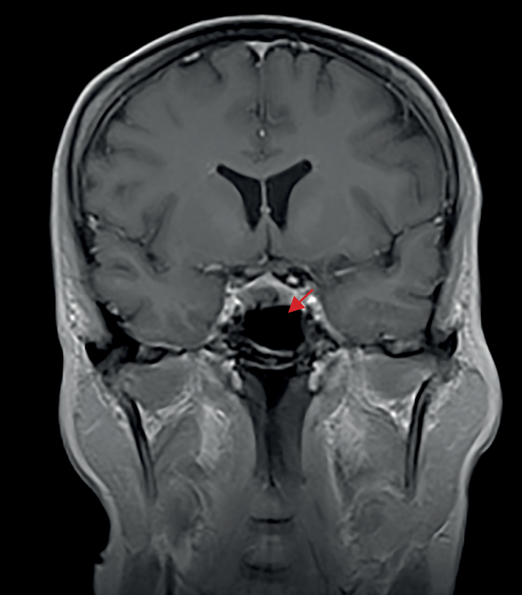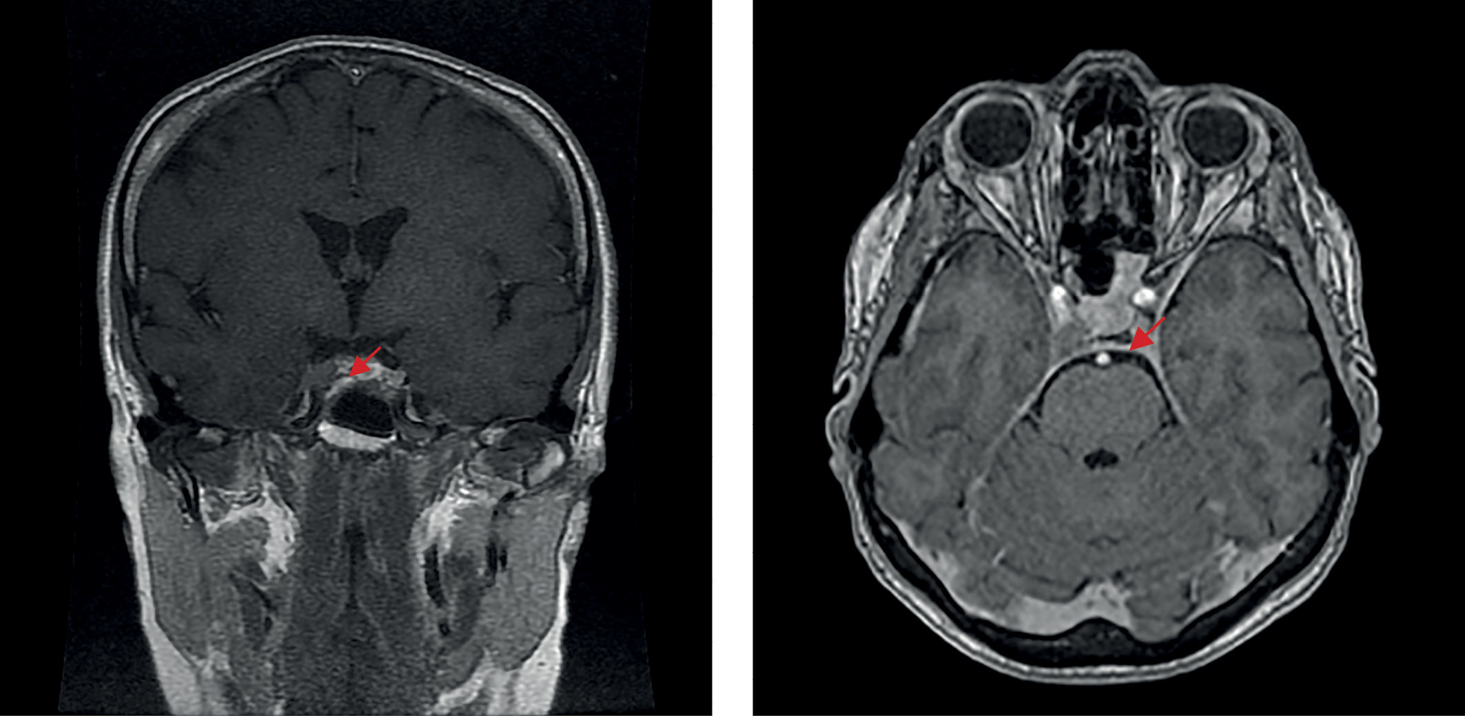С ноября 2017 г. стала отмечать изменения внешности в виде отечности лица и прибавки массы тела без изменения привычной диеты. Исходно и на фоне прибавки массы тела индекс массы тела (ИМТ) — норма, нарушений углеводного обмена и артериальной гипертензии (АГ) в анамнезе не было. Обращало внимание распределение жировых отложений преимущественно в области лица и живота. Кроме того, пациентку беспокоили жалобы неврологического характера (онемение конечностей, нарушения координации движений), с которыми обратилась к неврологу. По результатам проведенной МРТ головного мозга в 2018 г. выявлена микроаденома гипофиза размерами 9×6×6 мм (рис. 1). Гормональные исследования на предмет активности новообразования не проводили, специфического лечения назначено не было.