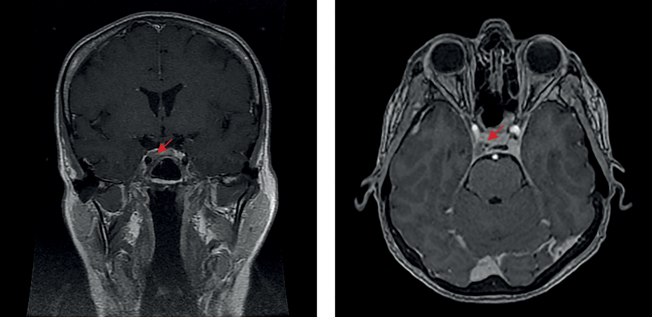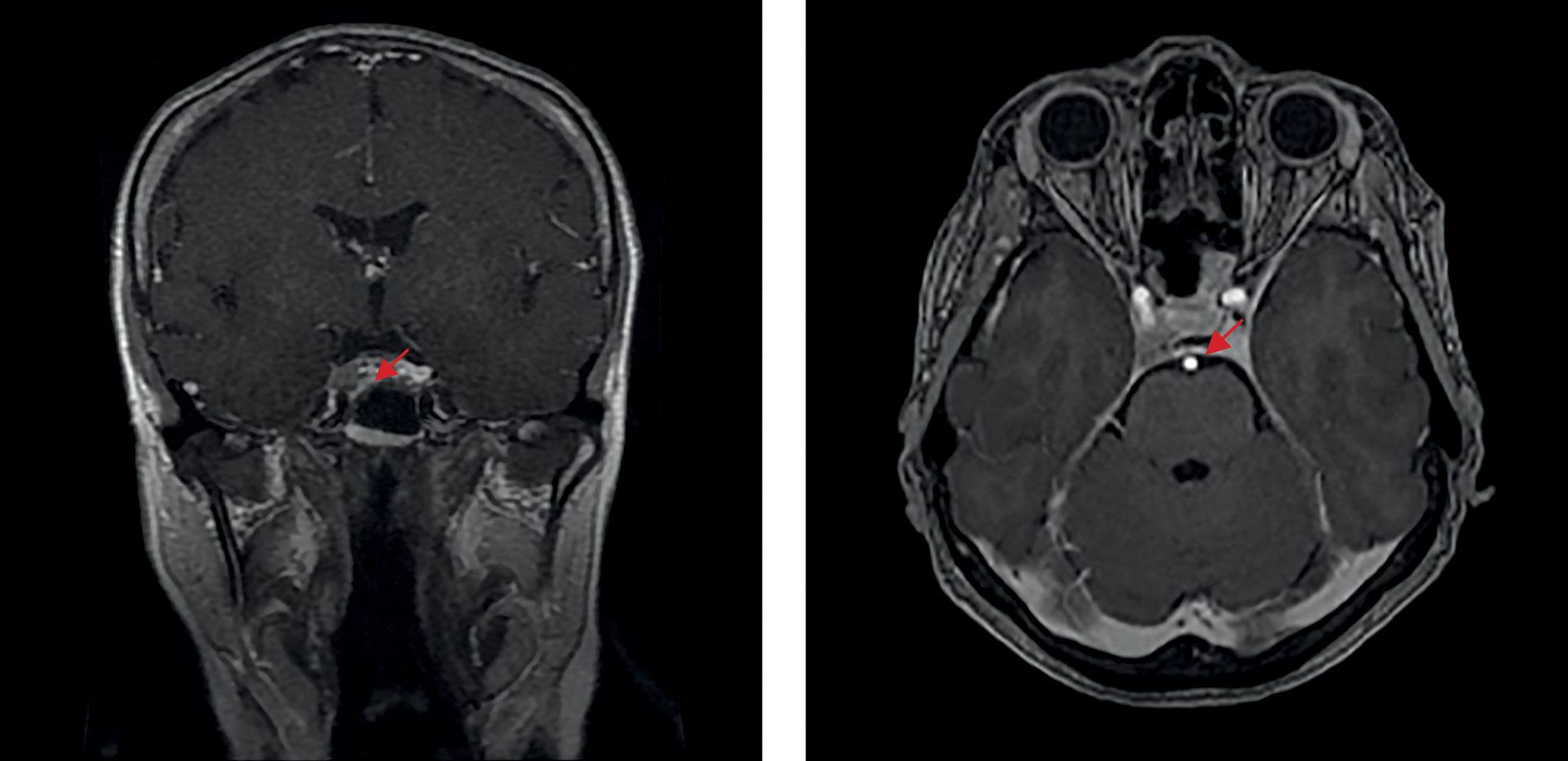 В июле 2021 г. перенесла новую коронавирусную инфекцию (COVID-2019) средней степени тяжести. C августа того же года вновь стала отмечать ухудшение самочувствия в виде повышения аппетита, прибавки массы тела (в течение 3 мес на 7 кг), нарушения сна, общей слабости, онемения конечностей, болей в суставах. По данным лабораторных исследований: декомпенсация по основному заболеванию (кортизол слюны в 23.00 — 27,0 нмоль/л, АКТГ утром — 90 пг/мл, кортизол на фоне малой дексаметазоновой пробы — 596 нмоль/л). При повторной госпитализации в ФГБУ «НМИЦ эндокринологии» Минздрава России в ноябре 2021 г.: кортизол в слюне вечером — 13,46 (0,5–9,65) нмоль/л, кортизол в суточной моче — 398 (100–379) нмоль/сут, ритм АКТГ (утро/вечер) — 63,55/36,65 пг/мл. Проведено МРТ-исследование головного мозга с контрастным усилением (рис. 3), выявлена макроаденома гипофиза размерами 6×9×11 мм с эндо-, латероселлярным распространением вправо, по шкале Knosp-IV (полное окружение кавернозного сегмента внутренней сонной артерии опухолью). При оценке минеральной плотности кости (МПК) методом рентгеновской денситометрии верифицированы остеопения в поясничном отделе позвоночника (-1,3 по Т-критерию) и в левой бедренной кости (-1,0 по Т-критерию), остеопороз дистальной трети левой лучевой кости (-3,1 по Т-критерию). Проведен консилиум совместно с заведующим отделением нейрохирургии, учитывая особенности размеров и характера роста опухоли, отсутствие полной лабораторной ремиссии при наличии ремиссии клинической, было принято решение о динамическом наблюдении и проведении трансназальной транссфеноидальной аденомэктомии на фоне выраженной активности основного заболевания.