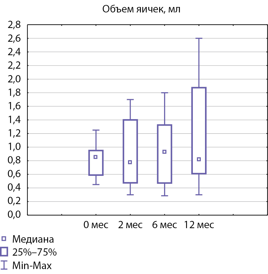Рисунок 2. Медиана объема яичек до начала терапии и через 2, 6 и 12 месяцев лечения.