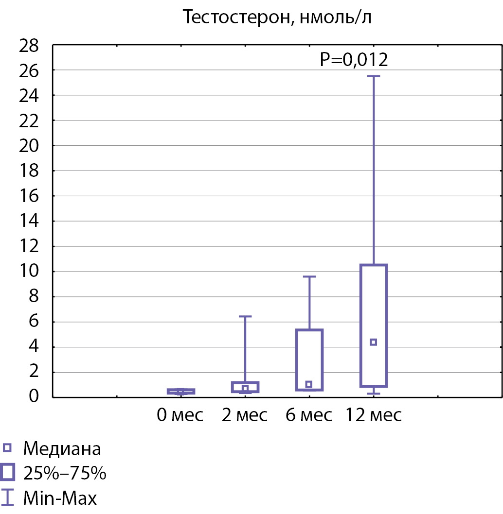 Рисунок 3. Медиана показателей тестостерона до начала терапии и через 2,6 и 12 месяцев лечения (p<0,05).