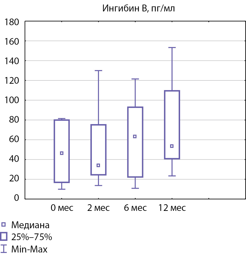 Рисунок 4. Медиана уровня ингибина B до начала терапии и через 2, 6 и 12 месяцев терапии.