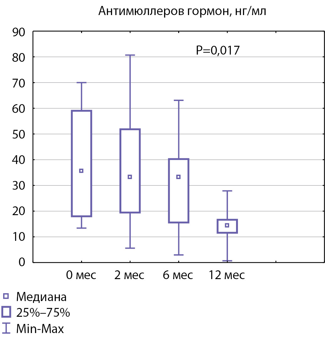 Рисунок 5. Медиана уровня АМГ до начала терапии и через 2, 6 и 12 месяцев терапии (p<0,05).