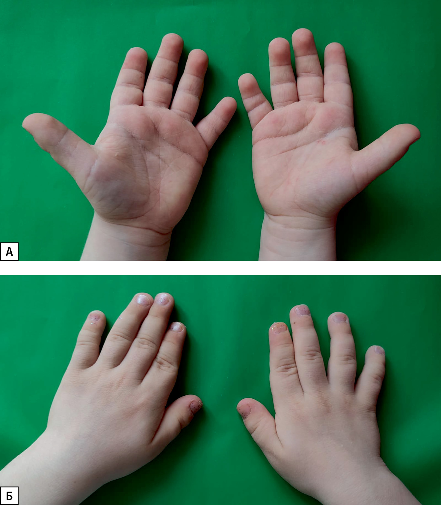 Рисунок 1. А — кисти пациента 1 (ладонная поверхность). Отмечаются брахидактилия, «плодные» подушечки пальцев, исчерченность ладоней. Б — кисти пациента 1.