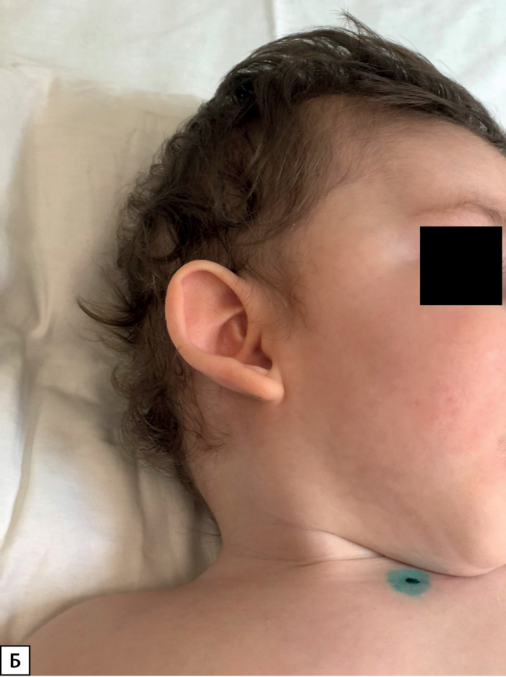 Рисунок 2Б. Фото пациента 2. Стигмы дисэмбриогенеза: оттопыренные чашевидные ушные раковины.