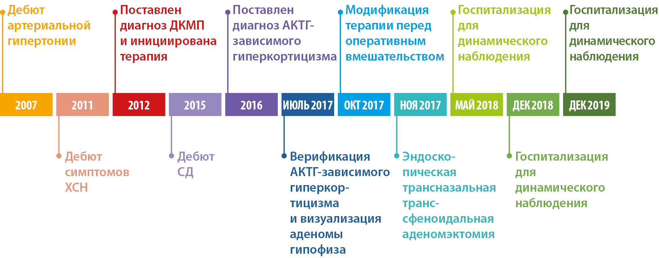 В 2015 г. в связи с прогрессированием симптомов СН и резистентностью к проводимой медикаментозной терапии была запланирована имплантация устройства для сердечной ресинхронизирующей терапии. При предоперационном обследовании было обращено внимание на прогрессирующее увеличение массы тела, выраженную мышечную слабость, плохое заживление кожных микротравм. Тогда же был диагностирован сахарный диабет (СД). Совокупность этих симптомов позволила заподозрить наличие ЭГ. К терапии был добавлен метформин (рис. 1).