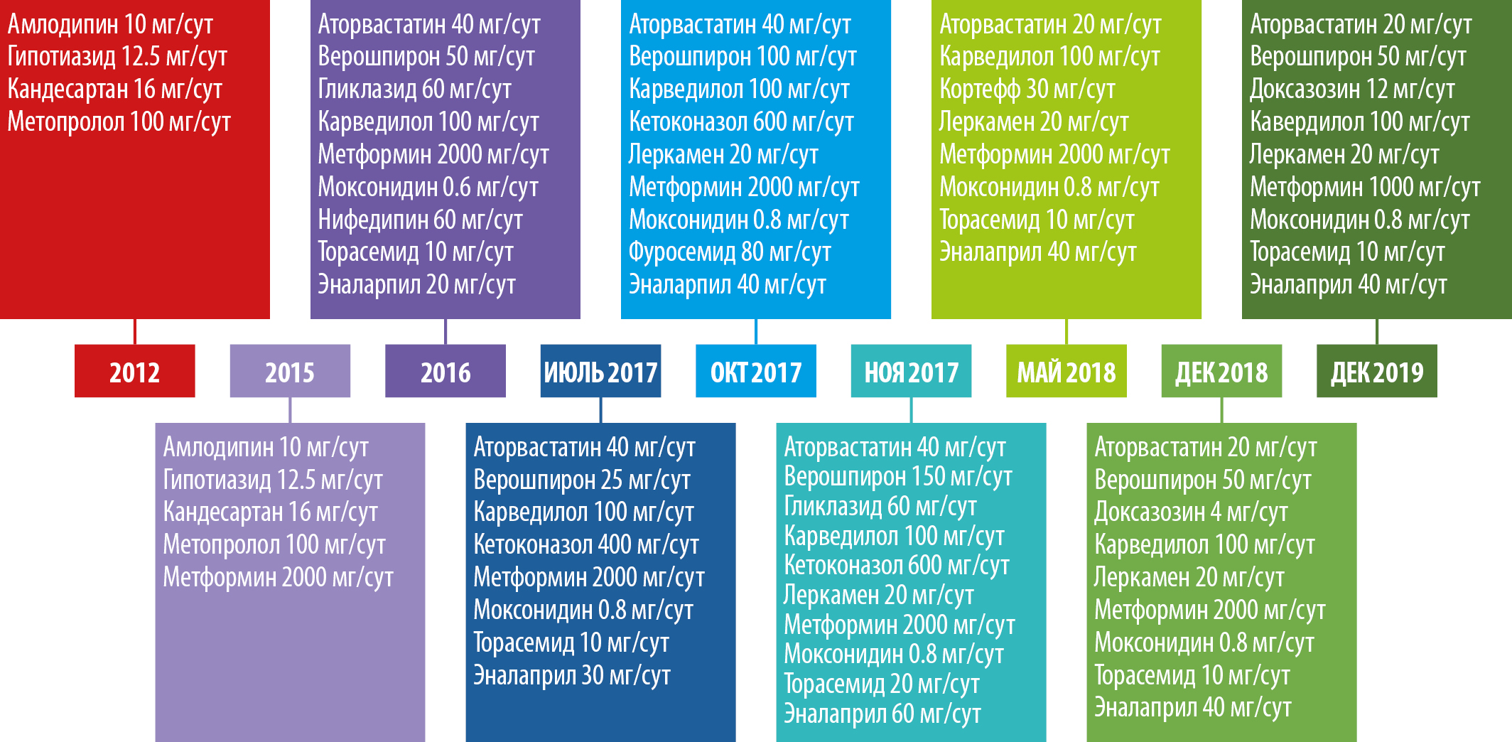 В 2012 г. диагностирована ДКМП, инициирована терапия бета-адреноблокаторами (бетаАБ), блокаторами рецепторов ангиотензина (БРА), дигидропиридиновыми блокаторами медленных кальциевых каналов (БМКК) и диуретиками (рис. 1).