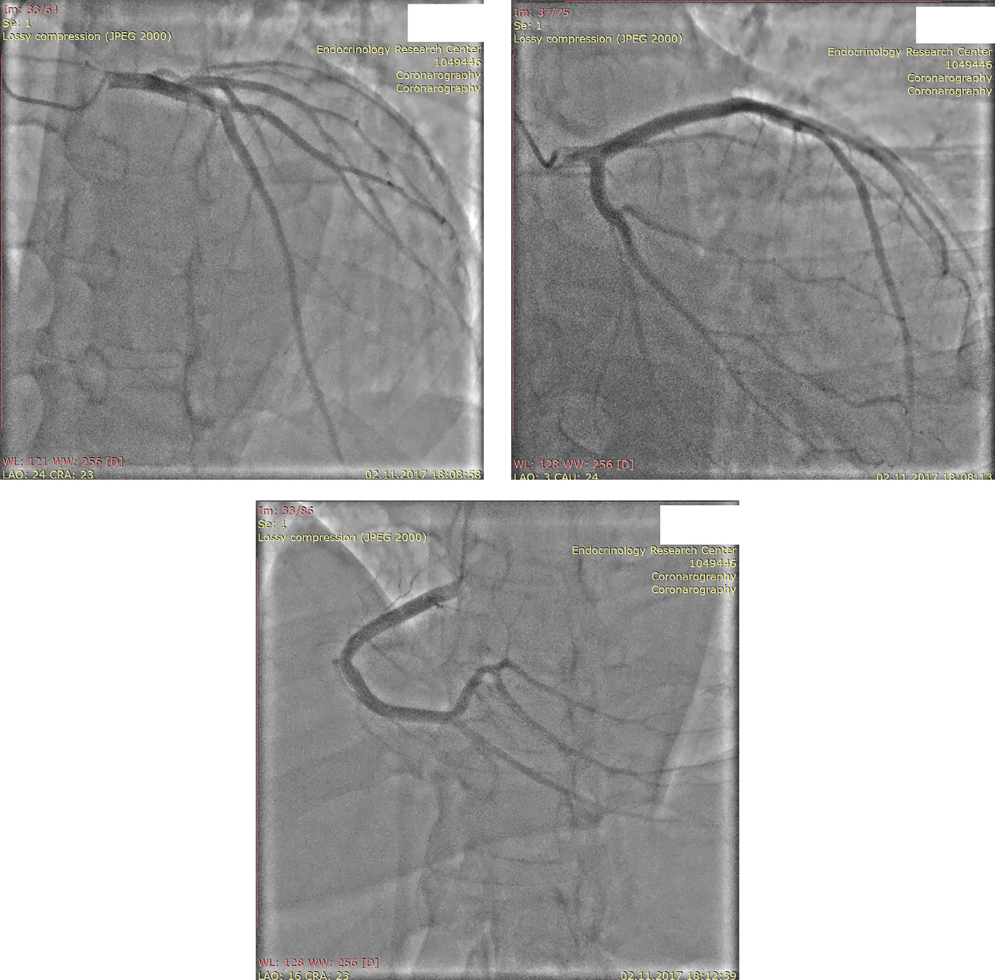 Пациент имел множественные факторы кардиоваскулярного риска (АГ, СД, атерогенная дислипидемия). С целью исключения ишемического генеза дисфункции ЛЖ была проведена коронароангиография (КАГ) (рис. 3). КАГ не выявила поражений коронарных артерий. Таким образом, было подтверждено предположение о неишемическом характере поражения миокарда.