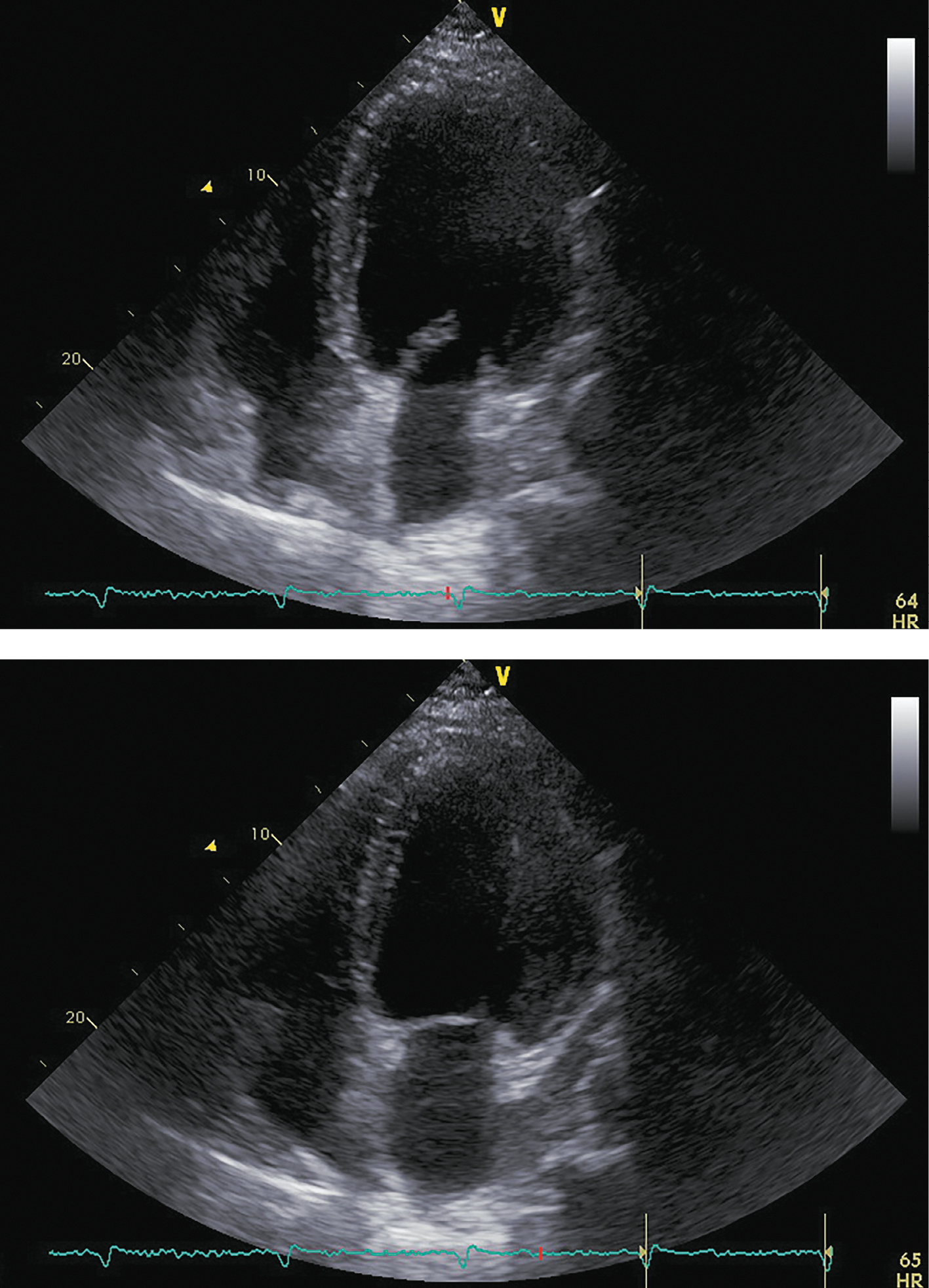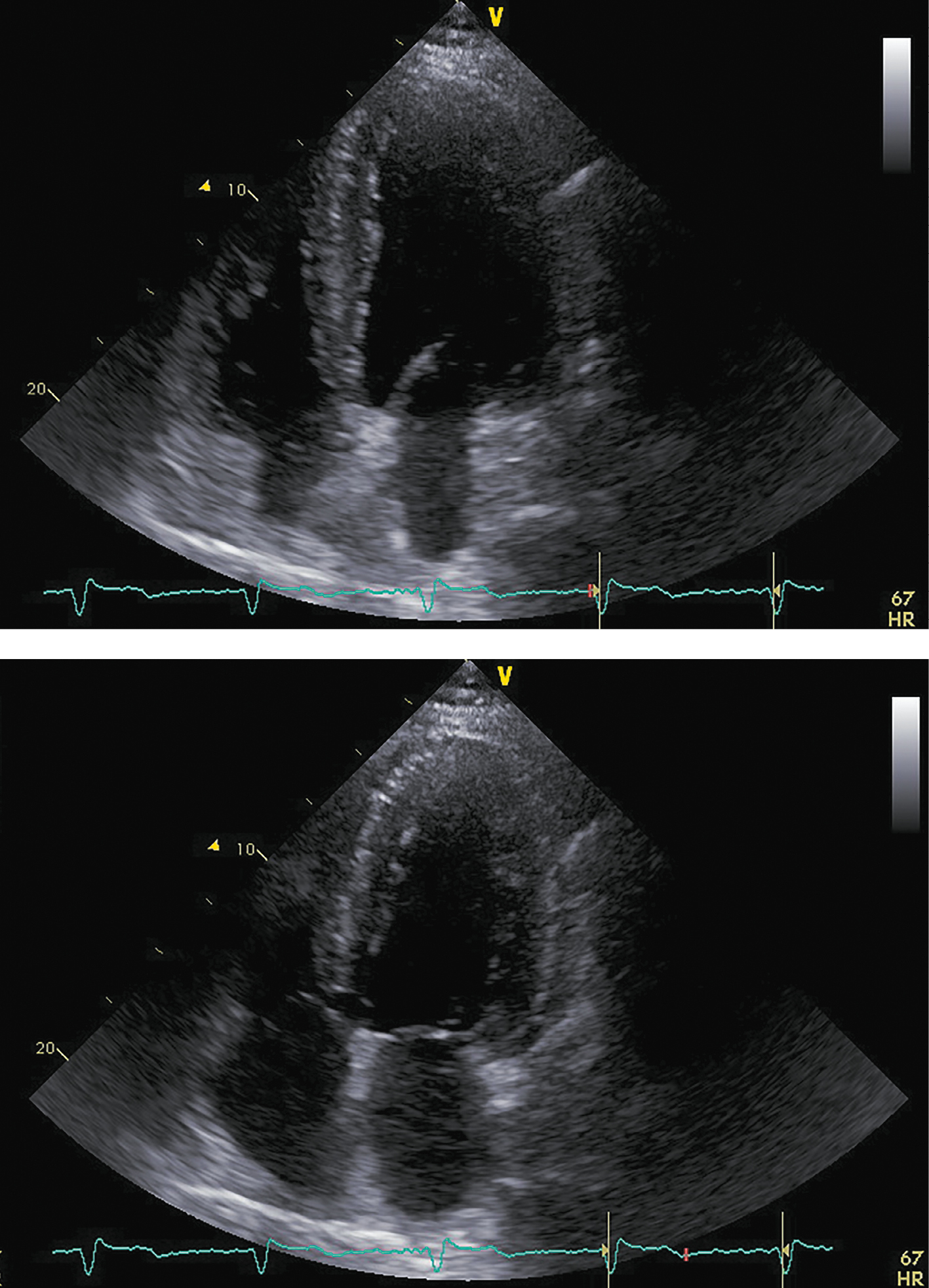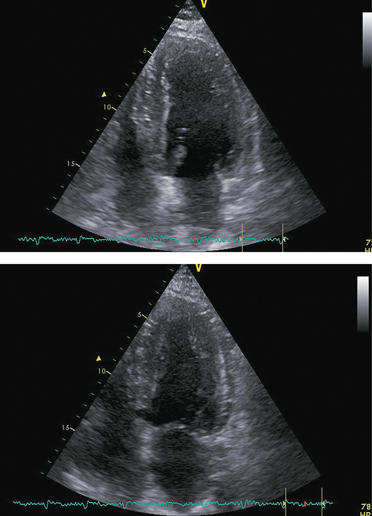 Примечание: верхушечная 4-камерная позиция (сверху представлен кадр в диастолу, снизу — в систолу).