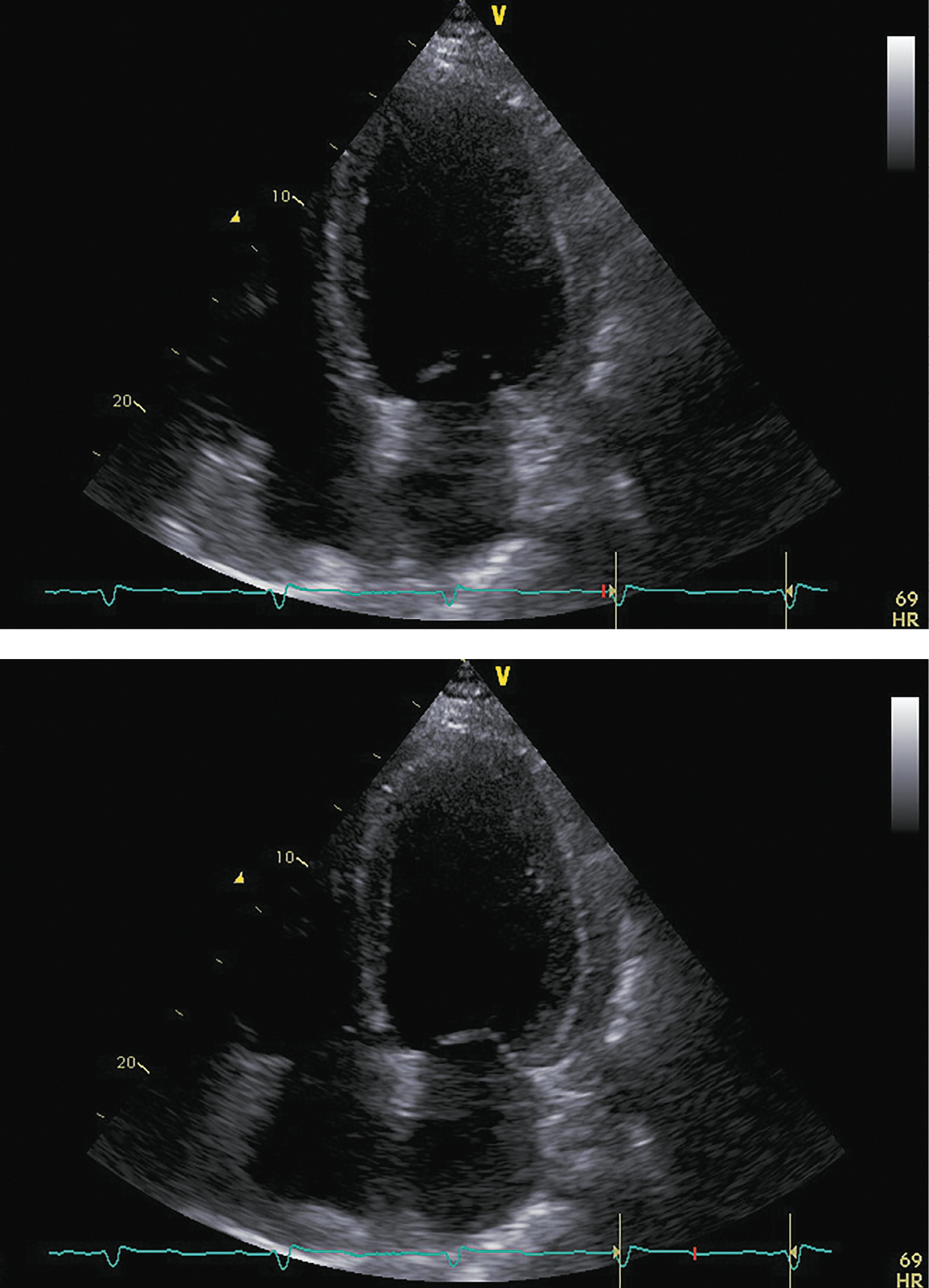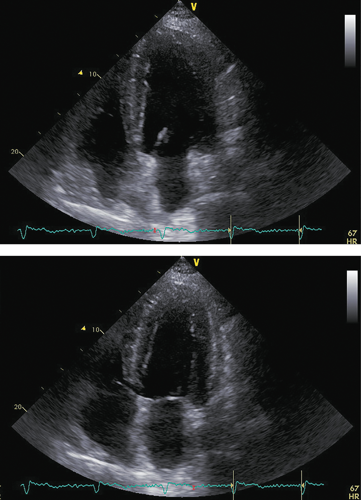 Примечание: верхушечная 4-камерная позиция (сверху представлен кадр в диастолу, снизу — в систолу).