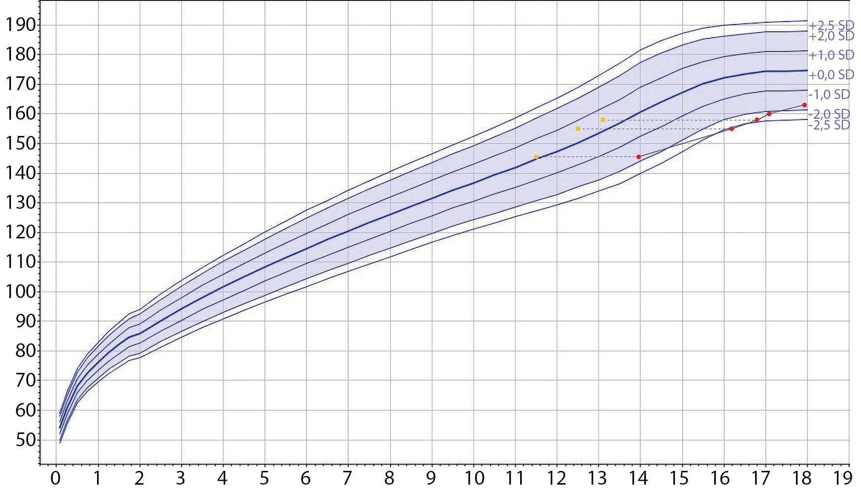 При обследовании в детском эндокринологическом отделении в 16,3 года (табл.1, рис. 1) впервые выявлена задержка роста (SDS роста -2,61) при отсутствии признаков полового созревания (Таннер 1); сохранялось отставание КВ (12,5 года от хронологического. При лабораторном исследовании выявлена нарушенная гликемия натощак; нарушений секреции пролактина, гормонов щитовидной железы и надпочечников не отмечено.