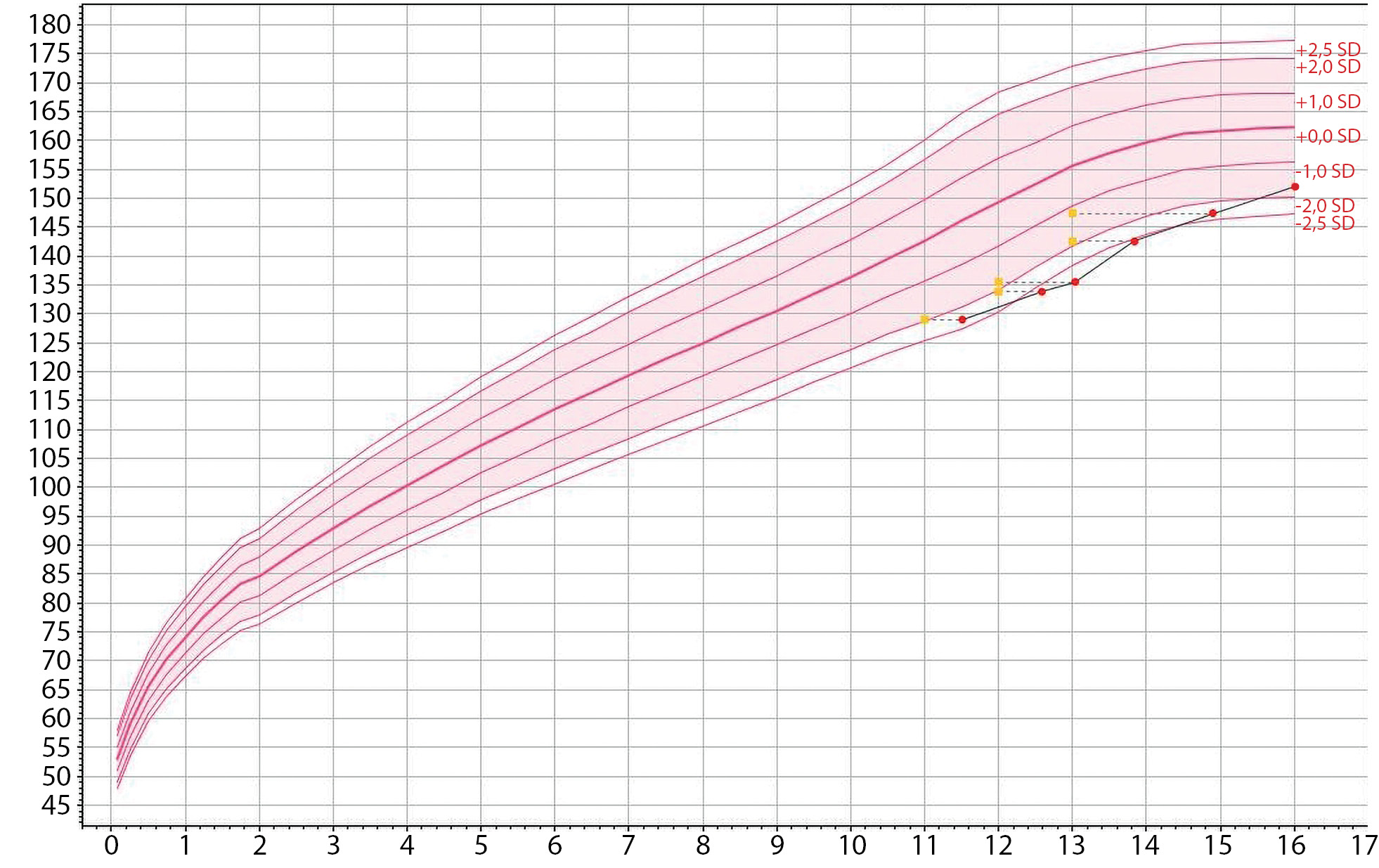 Clinical case 2. A girl with TD beta-thalassemia major at the age of 11.5 years presented with GH deficiency; GH therapy has been conducted from 12.8 to 15.3 years of age. At 13.8 years retardation of pubertal development was diagnosed. At 15.0 hyperglycemia 7.2 mmol/l was detected; normal results of oral glucose tolerance test (OGTT) were observed; glycemia elevations were up to 9.5 mmol/l according to CGM data. At 16.0 height was 152 cm; because of pubertal development arrest hormone replacement therapy was prescribed.