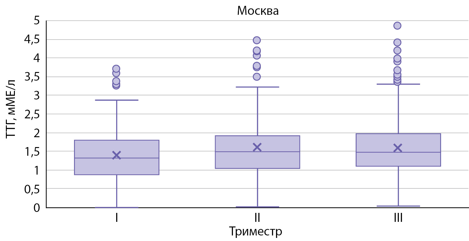 На рисунках 1–3 представлены значения ТТГ в зависимости от триместра беременности, региона проживания.
