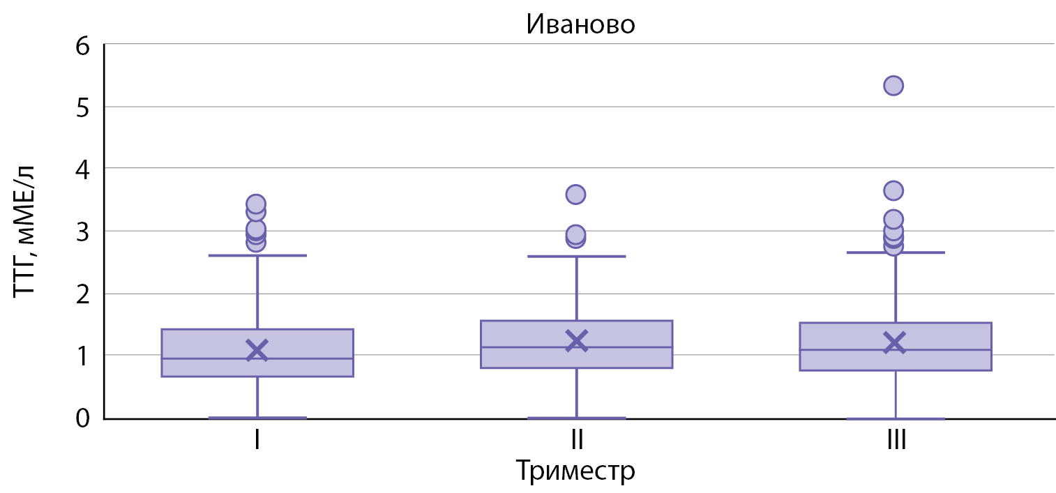 РЕЗУЛЬТАТЫ. Нами подтверждено наличие йодного дефицита на исследуемых территориях. Медианная концентрация йода в моче составила в Москве 106 мкг/л, в Иваново — 119 мкг/л, в Смоленске — 134 мкг/л. Пациенткам при первичной постановке на учет в женской консультации был рекомендован прием физиологических доз калия йодида 150–200 мкг в сутки. Женщины были разделены на 2 группы в соответствии с уровнем йодурии. В группе с оптимальным уровнем йодурии уровень ТТГ составил в I триместре 0,006–3,36, во II триместре — 0,20–3,74, в III триместре — 0,33–3,68 мМЕ/л. В группе с легким йодным дефицитом: в I триместре — 0,11–3,00, во II триместре — 0,22–3,78, в III триместре — 0,07–3,04 мМЕ/л. При статистическом анализе данных было выявлено, что при сопоставлении уровней ТТГ по триместрам в зависимости от места проживания статистической разницы не выявлено (p=0,239).