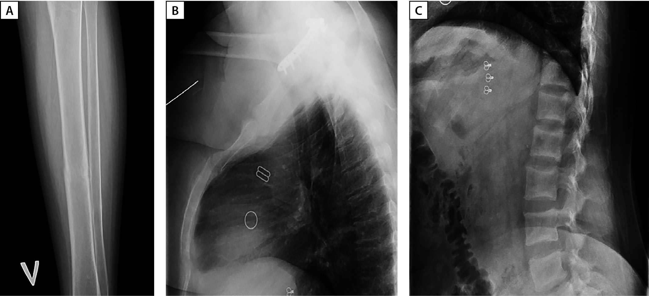 Рисунок 1. А — рентгенография левой голени в прямой проекции. Консолидированный перелом в средней трети без смещения. В — рентгенография грудного отдела позвоночника в боковой проекции. Гиперкифоз, умеренный остеохондроз, спондилез. Начальная компрессия тел Th7, Th8 позвонков по краниальной и каудальной площадкам преимущественно в передней трети позвонков (потеря до 5% массы). С — рентгенография поясничного отдела позвоночника в боковой проекции. Гиперлордоз, остеохондроз, ретролистез L4 и L1 на 2 мм. Начальная компрессия тел L5 (до 8% потери массы по каудальной площадке в задней трети позвонка), L3 ( до 5% в средней трети), L2 ( до 8% в средней трети) позвонков.
