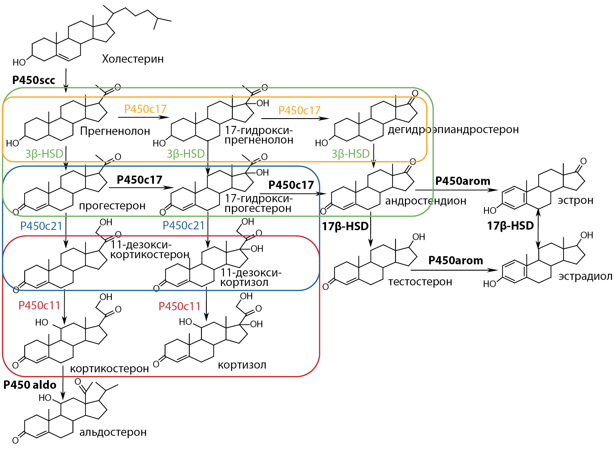 Примечания: Р450scc — 20,22-десмолаза; Р450с17 — 17α-гидроксилаза; 3β-HSD — 3β-гидроксистероиддегидрогеназа; P450c21 — 21-гидроксилаза; P450c11 — 11β-гидроксилаза; P450aldo — альдостеронсинтаза; 17β- HSD — 17β-гидроксистероиддегидрогеназа; P450arom — ароматаза. Желтым цветом выделена область активности фермента 17α-гидроксилазы/17, 20-лиазы; зеленым цветом — 3β-гидроксистероиддегидрогеназы; синим цветом — 21-гидроксилазы, красным цветом — 11β-гидроксилазы.