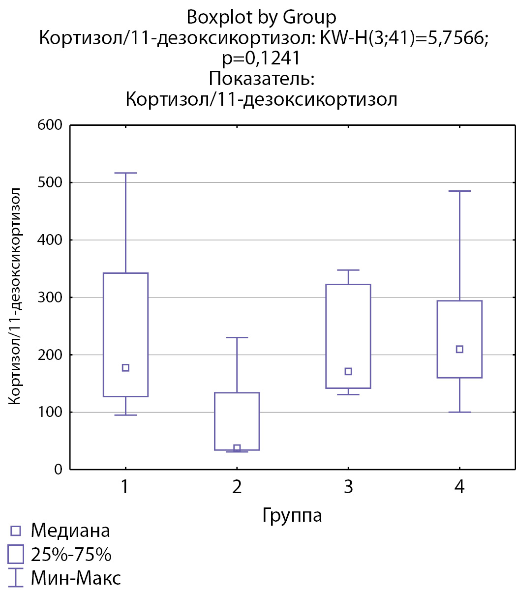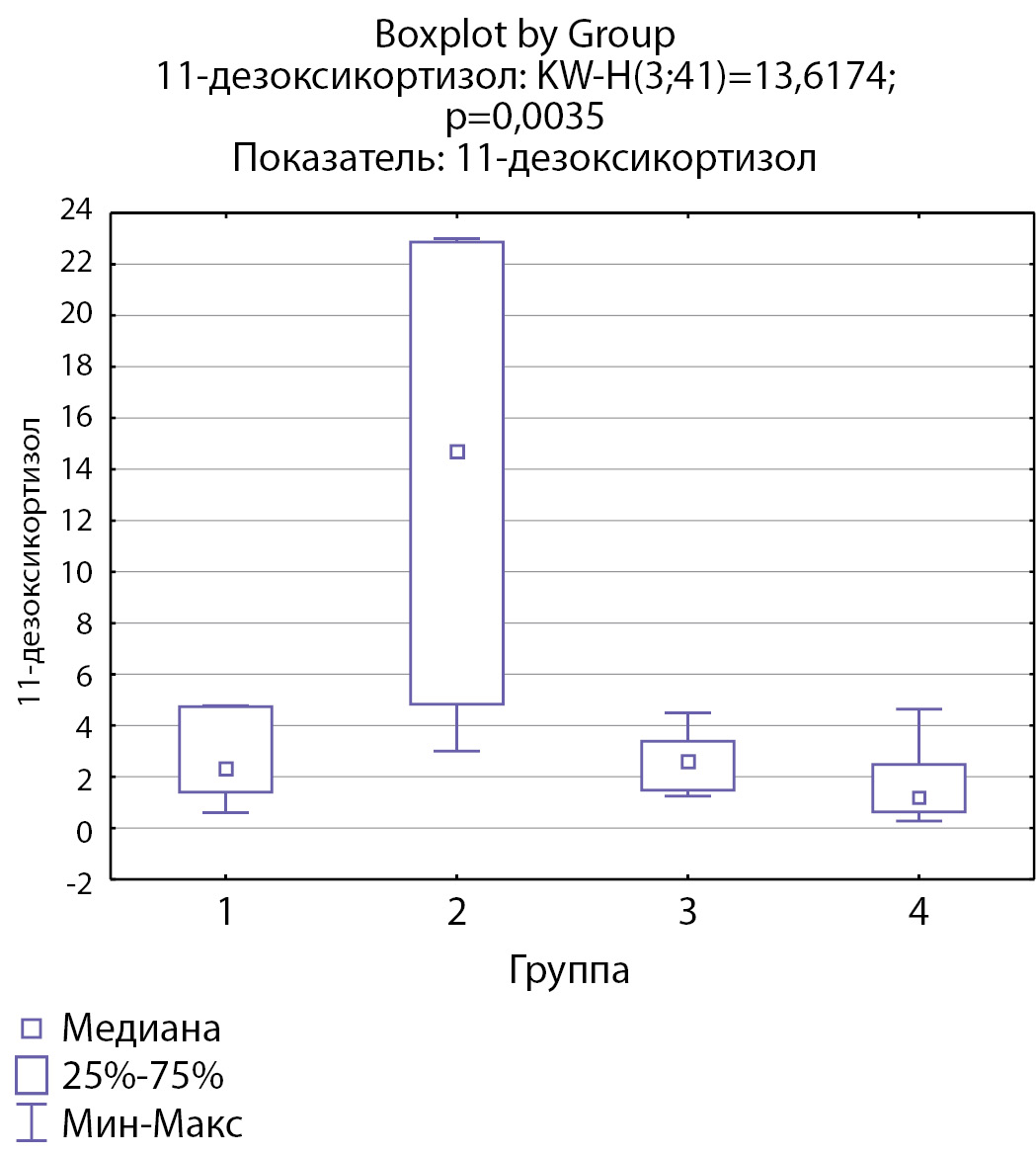 2. Рисунок 2. Распределение уровней 11-дезоксикортизола по группам: 1-я группа — пациенты с АКТГ-зависимым гиперкортицизмом (кортикотропиномы; n=7), 2-я группа — пациенты с АКТГ-независимым гиперкортицизмом (кортикостерома; n=4), 3-я группа — пациенты с инциденталомой надпочечников (n=7), 4-я группа — пациенты с преждевременным адренархе (n=23)