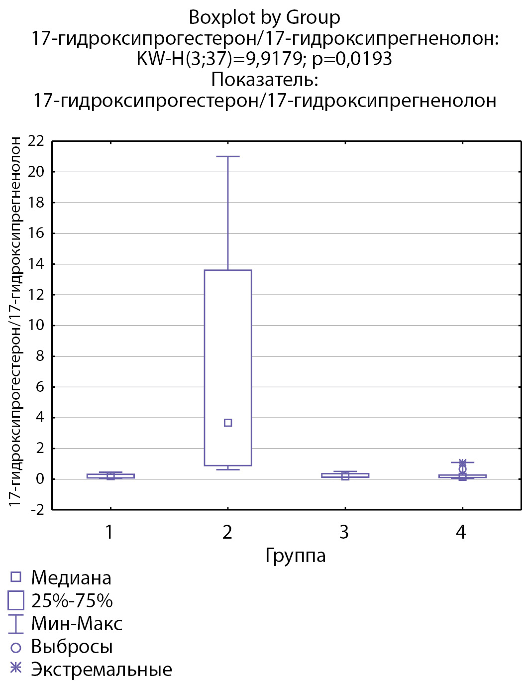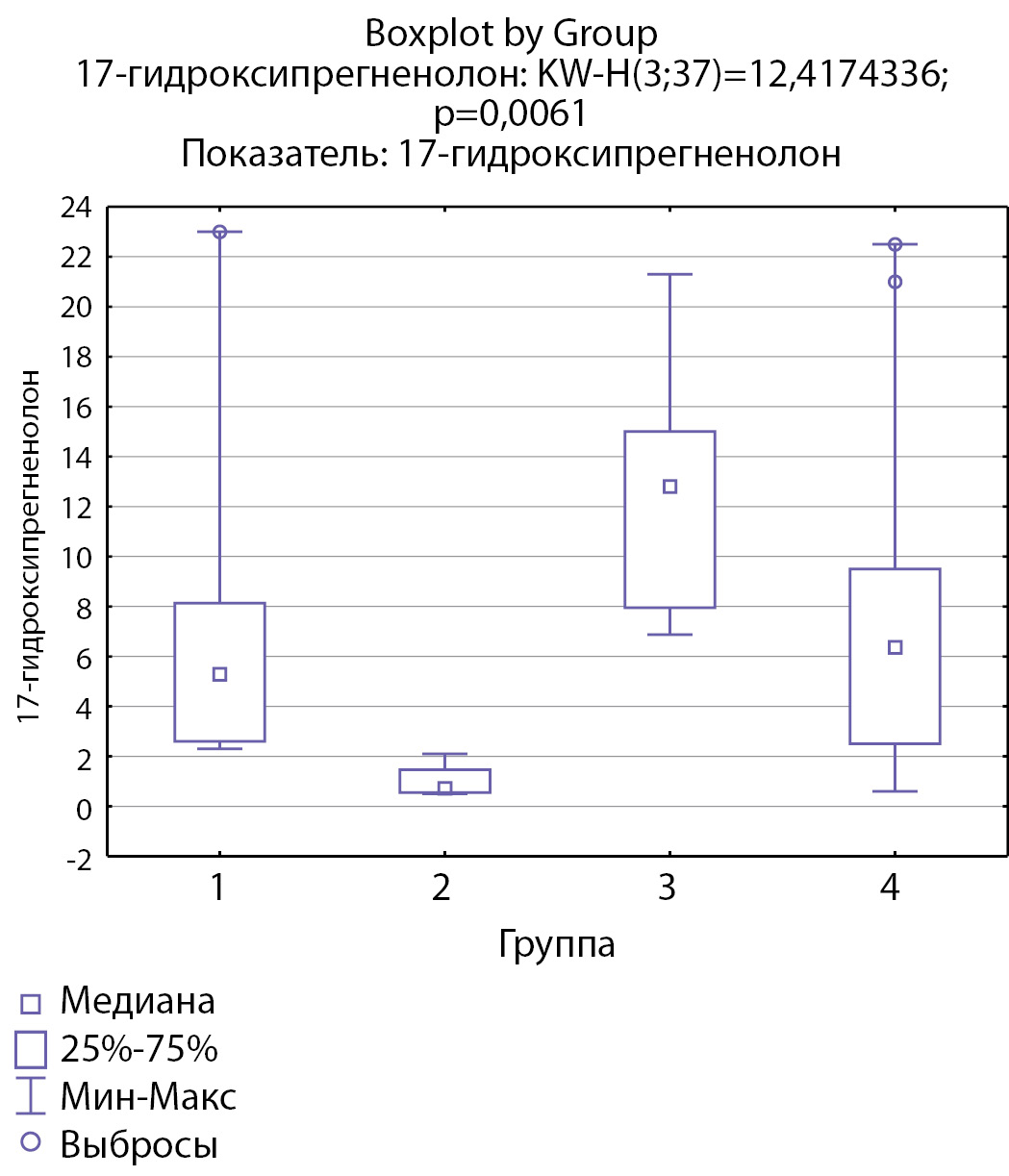 3. Рисунок 3. Распределение уровней 17-гидроксипрегненолона по группам: 1-я группа — пациенты с АКТГ-зависимым гиперкортицизмом (кортикотропиномы; n=7), 2-я группа — пациенты с АКТГ-независимым гиперкортицизмом (кортикостерома; n=4), 3-я группа — пациенты с инциденталомой надпочечников (n=7), 4-я группа — пациенты с преждевременным адренархе (n=19).