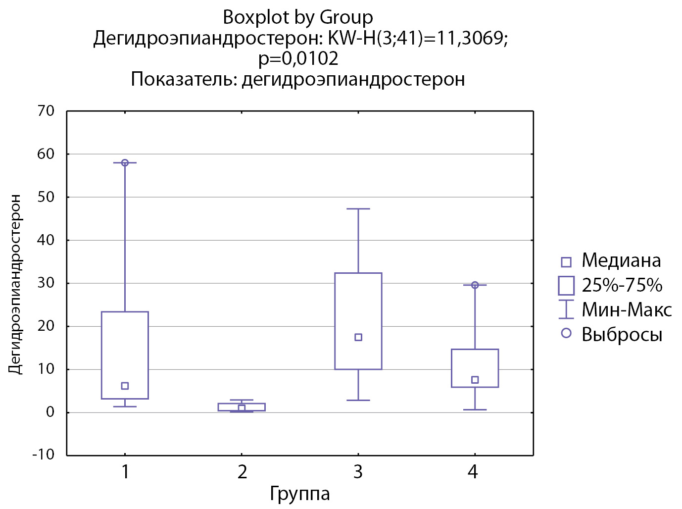 4. Рисунок 4. Распределение уровней дегидроэпиандростерона по группам: 1-я группа — пациенты с АКТГ-зависимым гиперкортицизмом (кортикотропиномы; n=7), 2-я группа — пациенты с АКТГ-независимым гиперкортицизмом (кортикостерома; n=4), 3-я группа — пациенты с инциденталомой надпочечников (n=7), 4-я группа — пациенты с преждевременным адренархе (n=23).