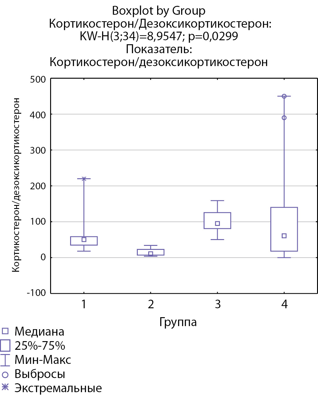 8. Рисунок 8. Соотношение дезоксикортикостерон/прогестерон по группам: 1-я группа — пациенты с АКТГ-зависимым гиперкортицизмом (кортикотропиномы; n=7), 2-я группа — пациенты с АКТГ-независимым гиперкортицизмом (кортикостерома; n=4), 3-я группа — пациенты с инциденталомой надпочечников (n=7), 4-я группа — пациенты с преждевременным адренархе (n=21).