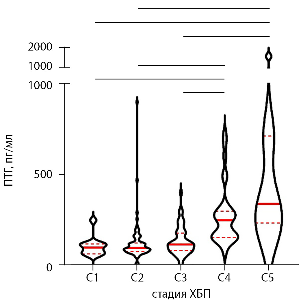Рисунок 1. Уровни ПТГ в группах реципиентов почки с различной функцией трансплантата. Тест Краскела–Уоллиса, р<0,0001. Горизонтальными линиями указаны сравнения пар групп, для которых получены достоверные различия (скорректированные значения p-value <0,0001 во всех случаях). Приведены медианы, первый и третий квартили, форма фигур отражает распределение признака. ПТГ —паратиреоидный гормон, ХБП — хроническая болезнь почек.