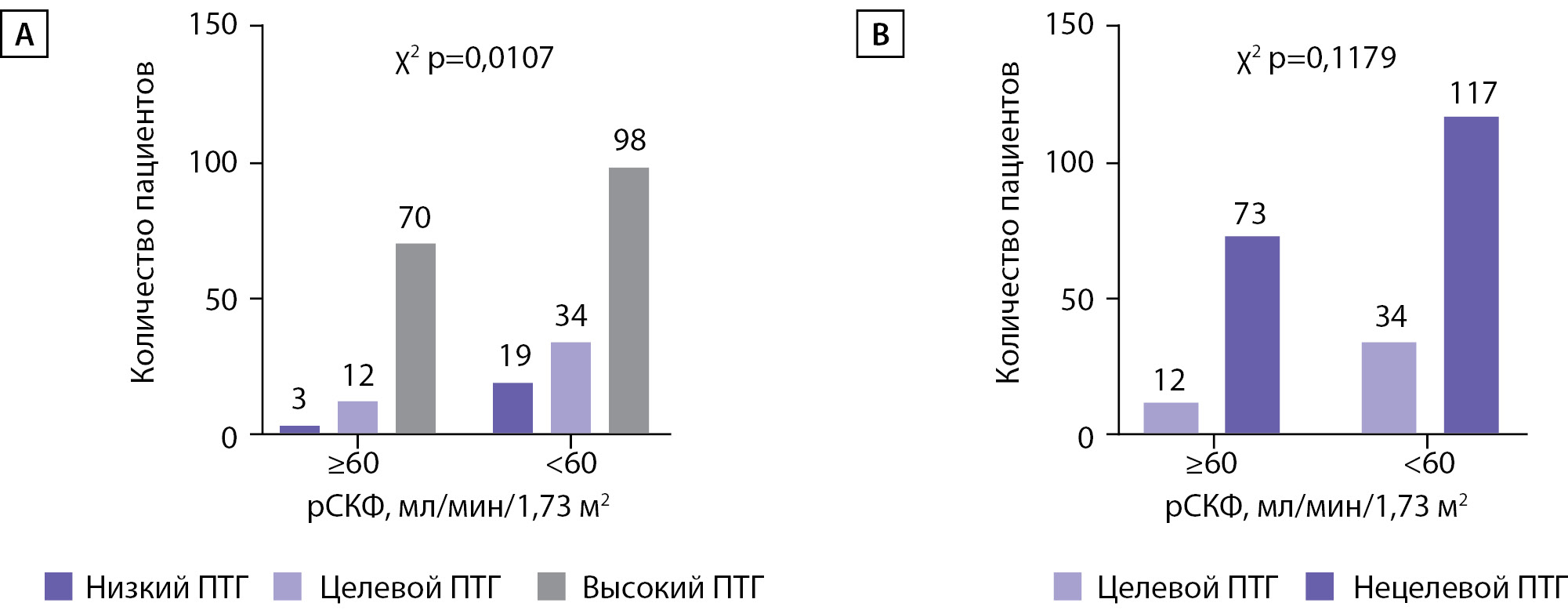 При этом доля пациентов, находящихся в целевом диапазоне ПТГ с учетом функции почечного трансплантата, составила 12,7%, ниже целевого — 3%, выше целевого — 84,3%. Доли пациентов с различными уровнями ПТГ статистически значимо различались при сравнении групп реципиентов со сниженной (менее 60 мл/мин/1,73 м2) и нормальной функцией трансплантата (рис. 2А). Однако при сравнении долей пациентов в целевом и отличном от целевого диапазонах ПТГ в группах с сохранной и сниженной рСКФ достоверных различий установлено не было (рис. 2В).