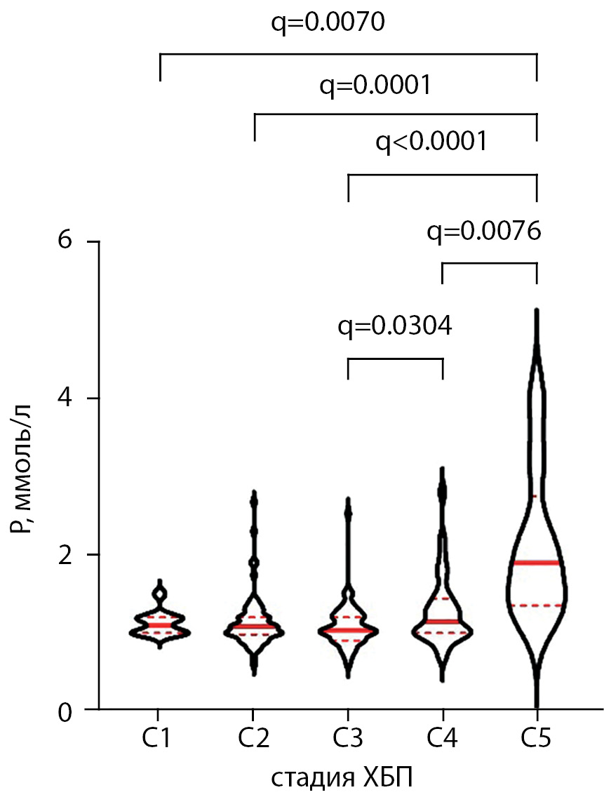 Рисунок 3. Уровни сывороточного фосфора в группах реципиентов почки с различной функцией трансплантата. Тест Краскела–Уоллиса, р<0,0001. Указаны скорректированные значения p-value (q) для достоверных различий между группами. Приведены медианы, первый и третий квартили, форма фигур отражает распределение признака. Р — фосфор сыворотки, ХБП — хроническая болезнь почек.