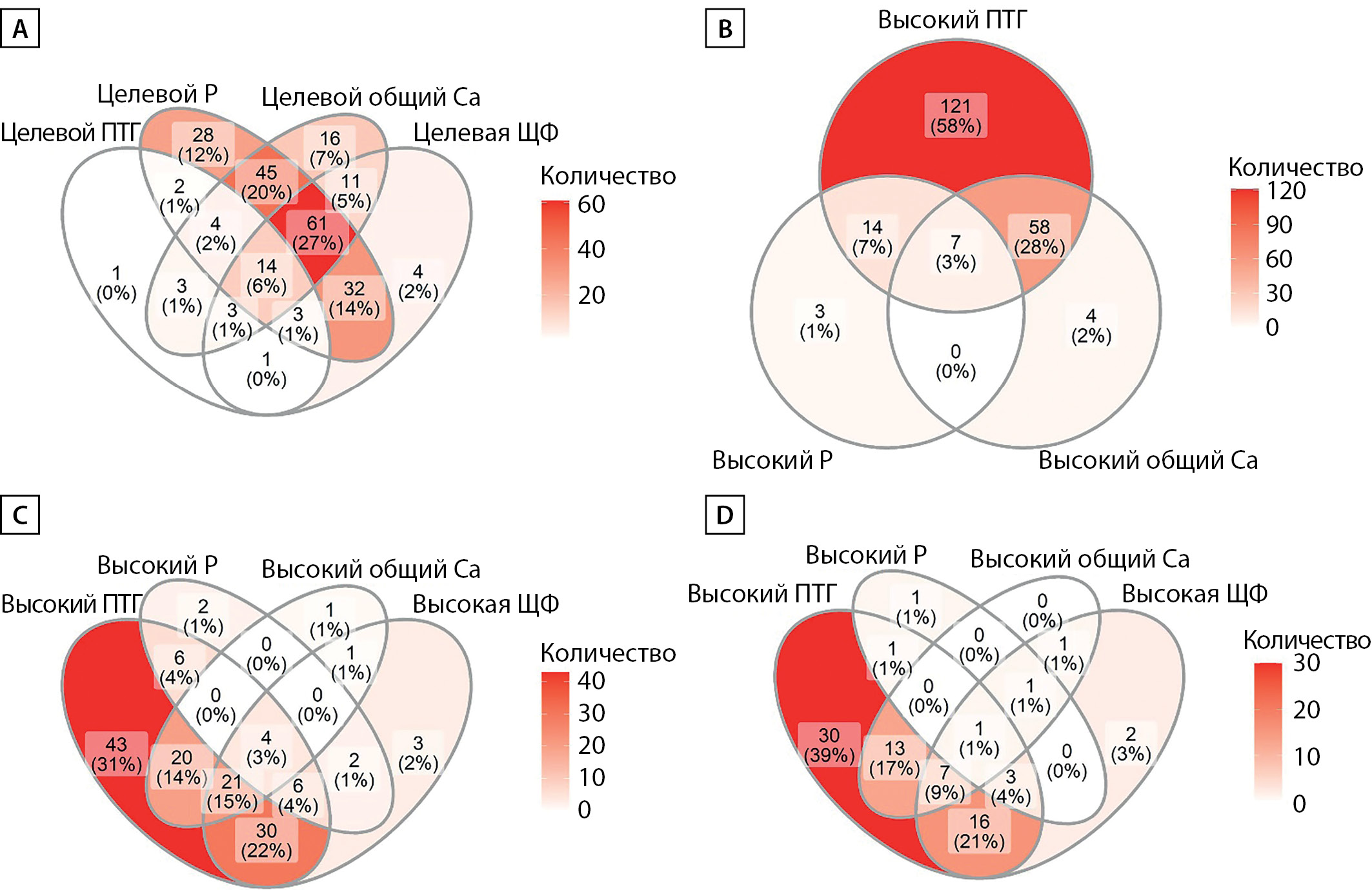 В целом на момент скрининга лишь 14 (6,2%) пациентов в нашей выборке демонстрировали уровни всех исследуемых показателей МКН-ХБП в пределах целевого диапазона (Рис. 4А). Сочетание повышенного уровня ПТГ и гиперкальциемии наблюдалось у 24% (20 из 85) пациентов с сохранной функцией трансплантата (Рис. 4D) и у 27% (41 из 151) пациентов со сниженной функцией трансплантата (Рис. 4С). Посттрансплантационный гиперпаратиреоз в сочетании с гиперкальциемией и гипофосфатемией (типичная триада проявлений МКН у реципиентов почечного трансплантата) наблюдался лишь у 3% пациентов в нашей выборке, в то время как сочетание повышенного ПТГ и гиперкальциемии было отмечено почти у трети пациентов (Рис. 4B).