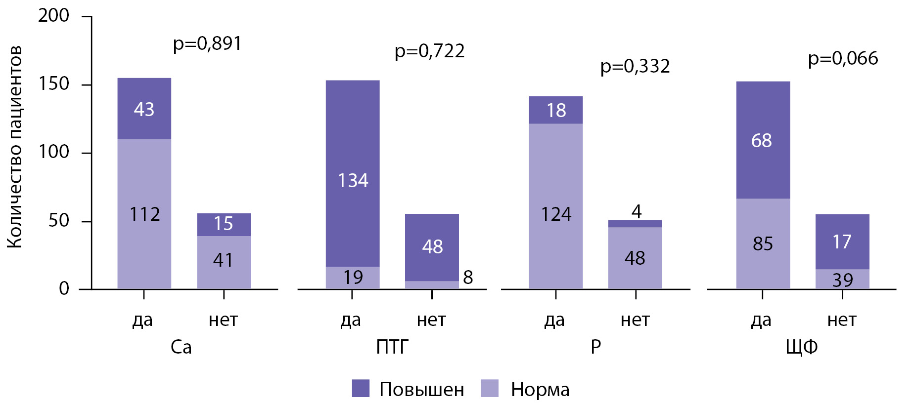 Нами было проведено сравнение лабораторных данных пациентов, получавших и не получавших терапию МКН-ХБП препаратами аналогов витамина D. Из анализа были исключены пациенты, принимающие препараты других групп. Суммарно лечение альфакальцидолом или колекальциферолом получали 156 пациентов, без терапии — 57 пациентов. При этом не было выявлено различий между уровнями общего кальция, ПТГ, фосфора и ЩФ при сравнении как абсолютных значений (р=0,984, р=0,07, р=0,335 и р=0,153 соответственно), так и соотношения долей пациентов в целевом диапазоне и выше него в этих двух группах (рис. 5).