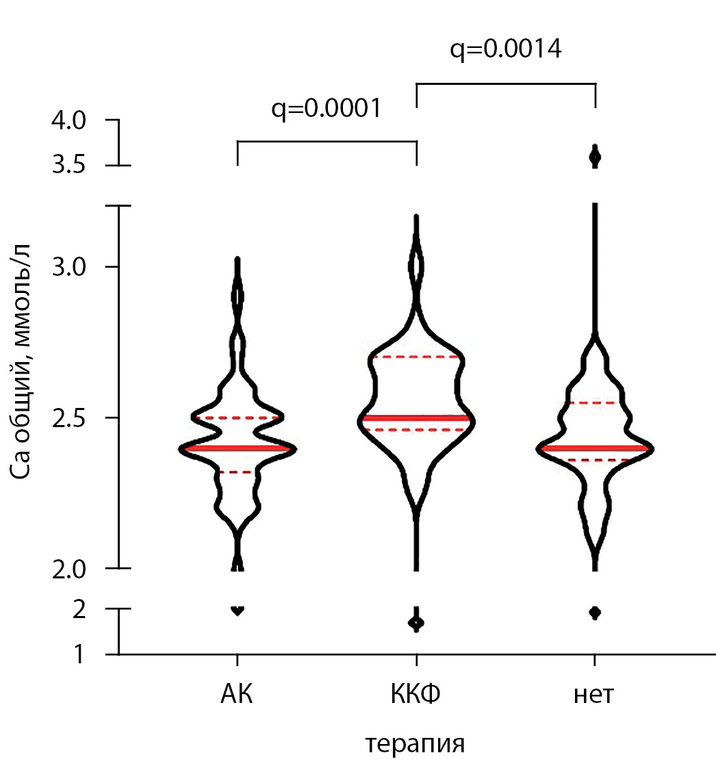Рисунок 6. Уровни общего кальция сыворотки реципиентов ПТ в группах, получающих и не получающих терапию МКН-ХБП. АК —альфакальцидол, ККФ — колекальциферол. Тест Краскела-Уоллиса, р=0,0006. Указаны скорректированные значения p-value (q) для достоверных различий между группами. Приведены медианы, первый и третий квартили, форма фигур отражает распределение признака. АК — альфакальцидол, ККФ – колекальциферол.