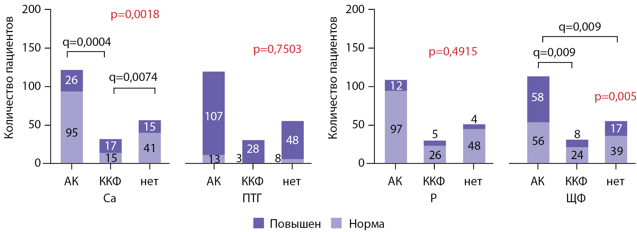 Рисунок 7. Распределение пациентов, получающих и не получающих терапию различными препаратами витамина Д, по категориям по уровню общего кальция, ПТГ, фосфора и ЩФ. Красным цветом обозначены результаты омнибусного теста, также приведены скорректированные значения p-value (q) для достоверных различий между группами. АК — альфакальцидол, ККФ — колекальциферол, Са — общий кальций, ПТГ — паратиреоидный гормон, Р — фосфор сыворотки, ЩФ — щелочная фосфатаза сыворотки.