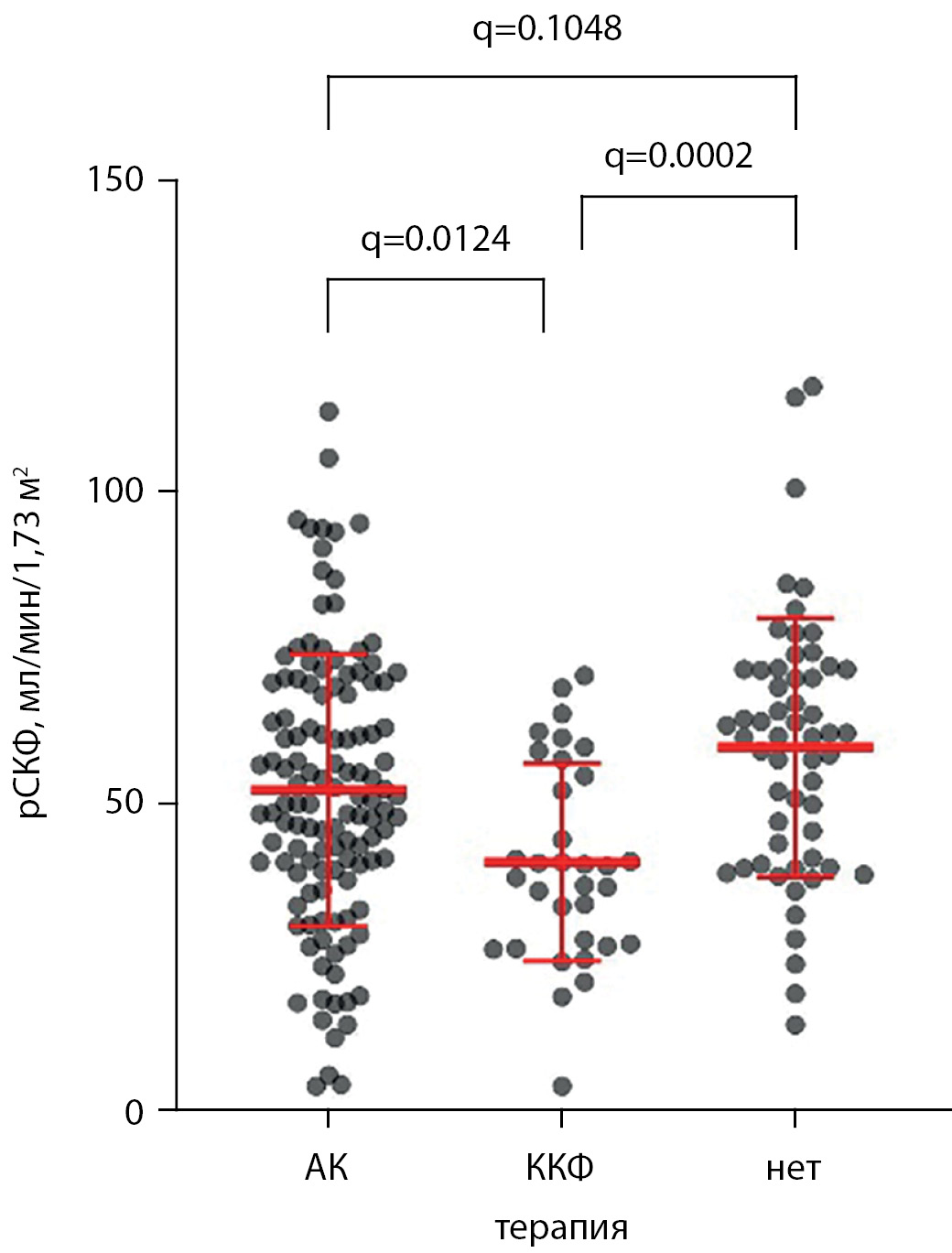 Рисунок 8. Значения рСКФ реципиентов ПТ, получающих и не получающих терапию различными препаратами витамина Д. АК — альфакальцидол, ККФ — колекальциферол. ANOVA р=0,0003. Приведены скорректированные значения p-value (q). Приведены распределение, среднее значение, стандартное отклонение среднего. АК — альфакальцидол, ККФ — колекальциферол, рСКФ — расчетная скорость клубочковой фильтрации.