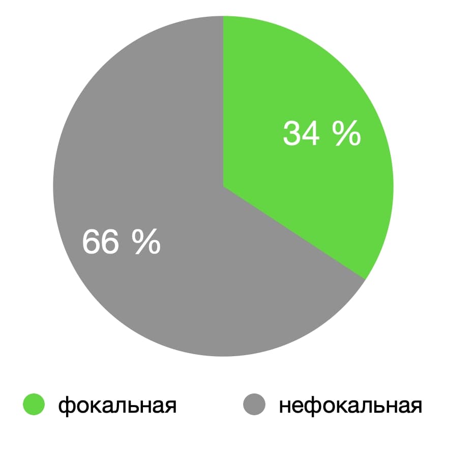 RESULTS: Among 73 patients with CHI, 35% (23) had focal form of the disease, 65% had non-focal form (49% (39) — diffuse form, 16% (11) — atypical form). All patients with focal form of CHI had a recovery as an outcome.