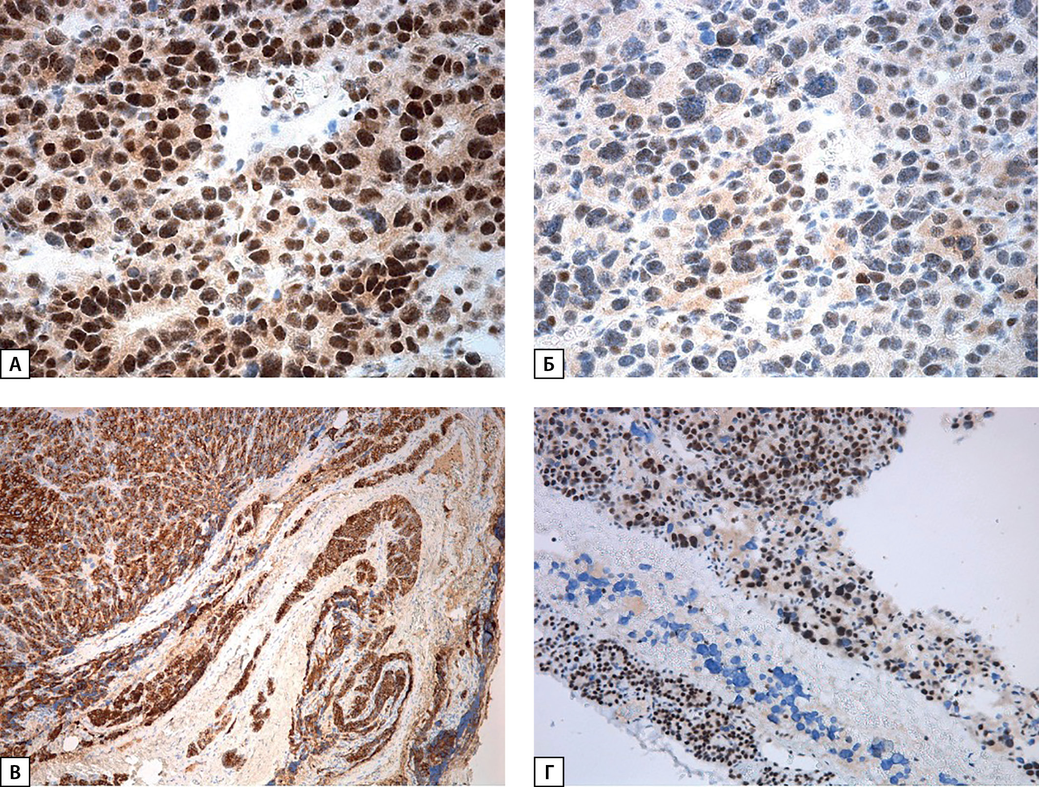 4. Рисунок 4. Окраска на парафибромин: А, Б — участки с позитивным окрашиванием ядер разной интенсивности и поля цитоплазматической реакции, ×400; В — выраженная ядерная экспрессия в окружающей опухоль паратиреоидной ткани, ×100. | |
