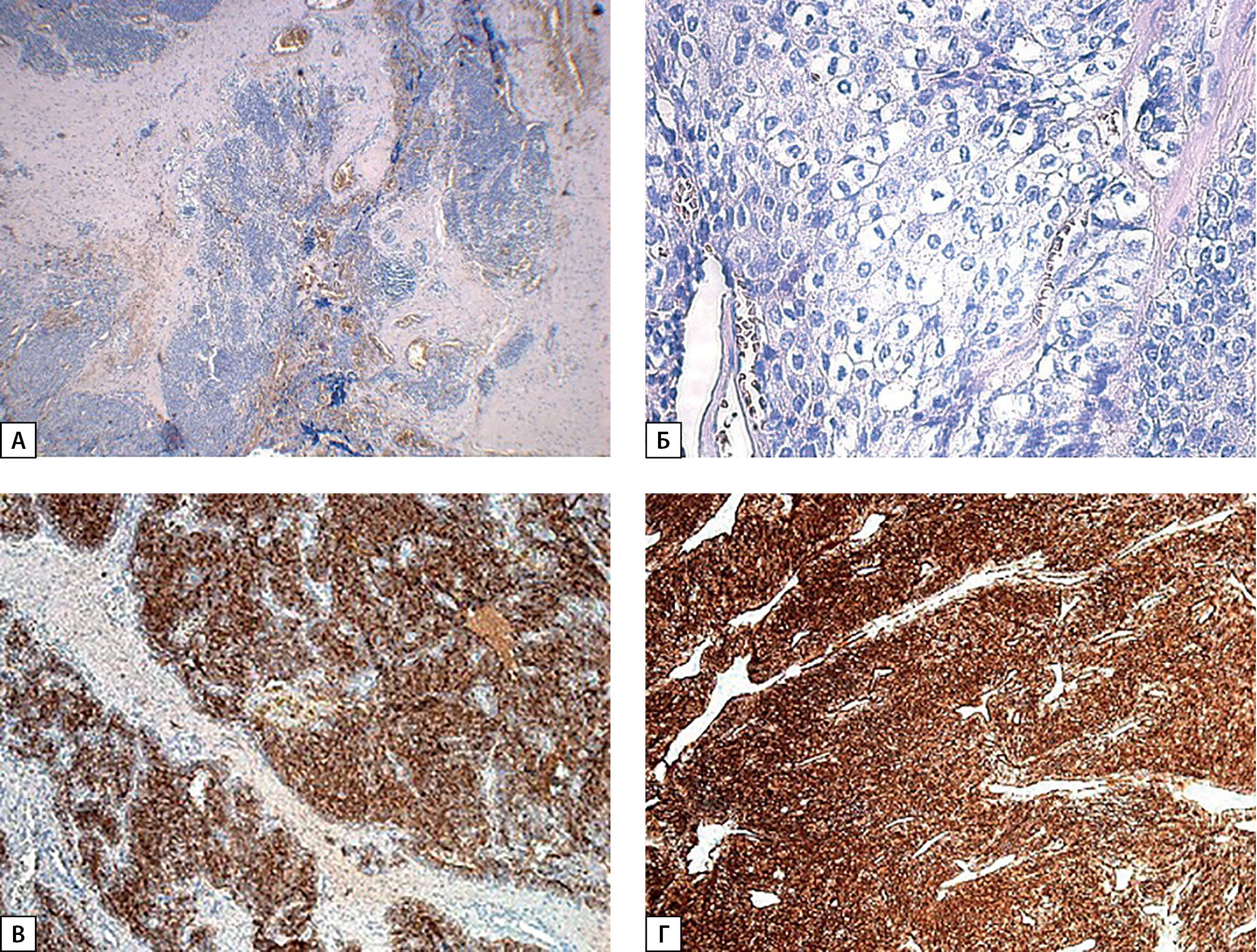 Рисунок 2. Гистологическое исследование бронхоскопии: А — рост опухоли гнездно-трабекулярного строения из небольших относительно мономорфных клеток со скудной светлой эозинофильной цитоплазмой, округлыми и овальными гиперхромными ядрами. Окраска гематоксилин-эозин (×100); Б — положительная реакция с антителом к TTF-1 в части опухолевых клеток. Иммуногистохимическое исследование (×100); В — индекс пролиферативной активности Ki-67 — 10%. Иммуногистохимическое исследование (×100); Г — положительная экспрессия ПТГ в опухолевых клетках. Иммуногистохимическое исследование (×100).