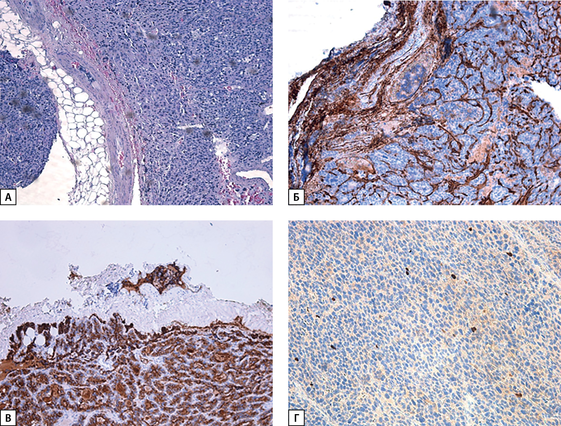 Рисунок 3. А — карцинома ОЩЖ, окраска гематоксилин-эозином (×100); Б — экспрессия CD34, сосудистая инвазия (×100); В — экспрессия ПТГ в опухоли за пределами капсулы; Г — экспрессия Ki-67 2%.