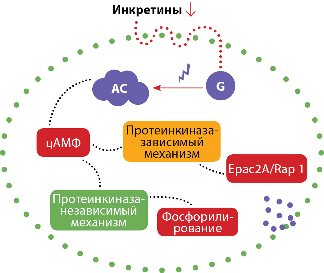 Инкретины, включая глюкагоноподобный пептид-1 (ГПП-1) и глюкозозависимый инсулинотропный полипептид (ГИП), являются важными метаболическими пептидами, ответственными за экспрессию гена инсулина, пролиферацию β-клеток и снижение уровня глюкозы путем стимулирования механизмов секреции инсулина (рис. 2) [46].