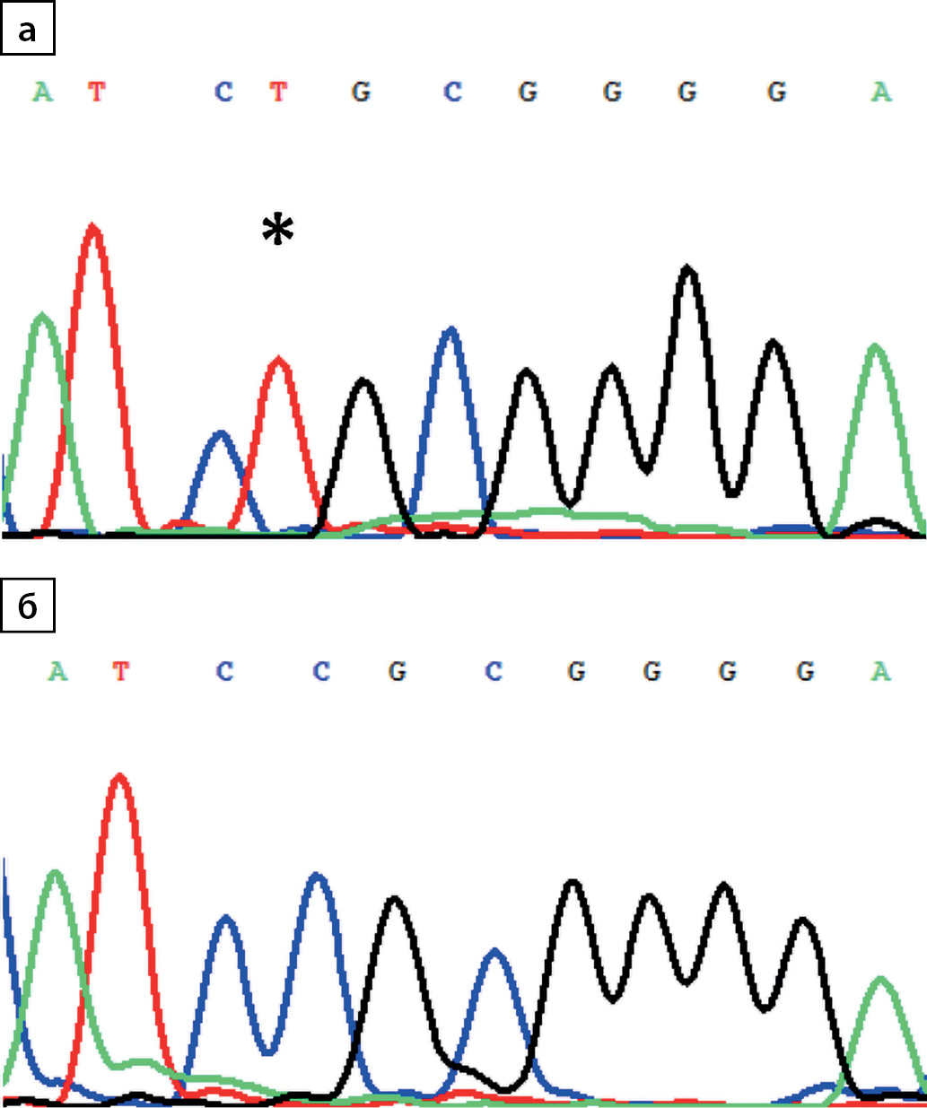 Рисунок 1. Электрофореграмма фрагмента последовательности экзона 1 гена AQP2: а) гомозиготная транзиция c.337C>T (*) с заменой кодона аргинина (CGC) на цистеин (TGC) в положении 113 (p.R113C); б) последовательность дикого типа.