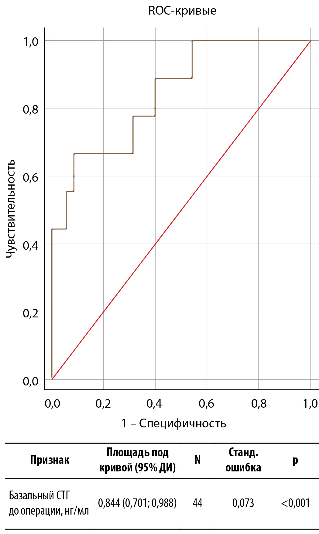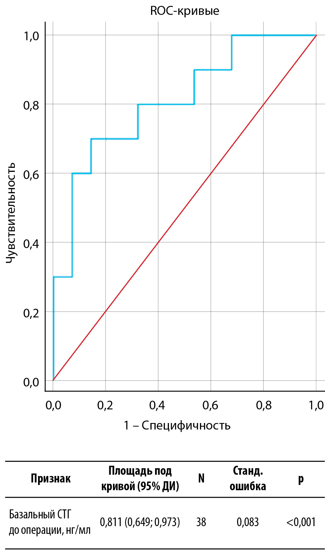 ROC-анализ с расчетом чувствительности, специфичности, прогностической ценности положительного результата (ПЦПР) и прогностической ценности отрицательного результата (ПЦОР) и их 95% доверительного интервала (ДИ) по методу Клоппера–Пирсона проводился для оценки прогностической ценности базального СТГ перед оперативным лечением.